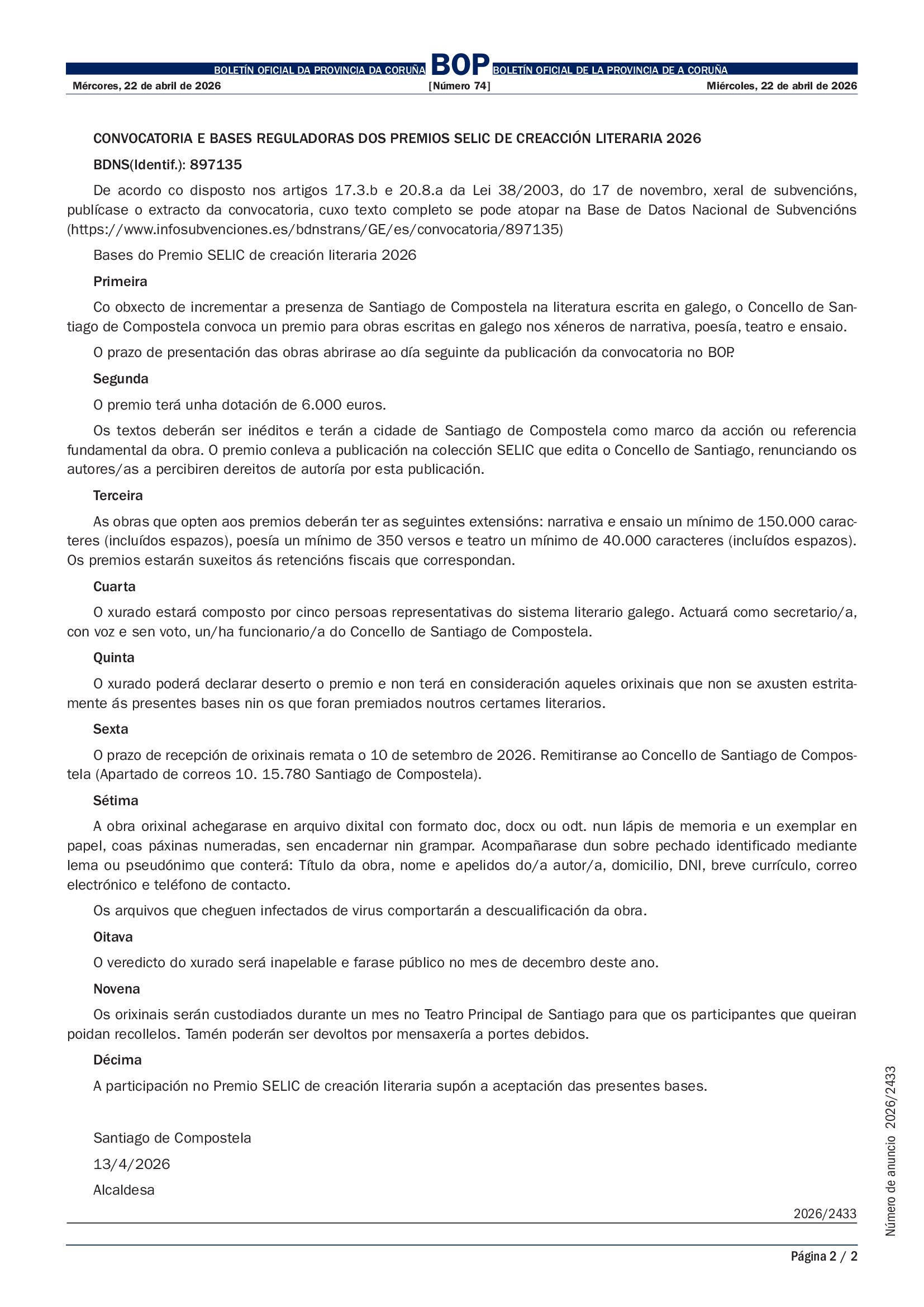 O proceso destes galardóns comezou coa preselección das obras realizada polos tres colectivos impulsores -AELG, AGE e FLG-, da que saíu a listaxe de 6 candidatas por categoría, a partir da que os xurados escollerán tres finalistas. Na seguinte fase daranse a coñecer as obras finalistas e o proceso rematará coa celebración da entrega de premios, na que se coñecerán as obras gañadoras na tradicional gala que terá lugar no Teatro Principal de Santiago o 9 de maio de 2026.