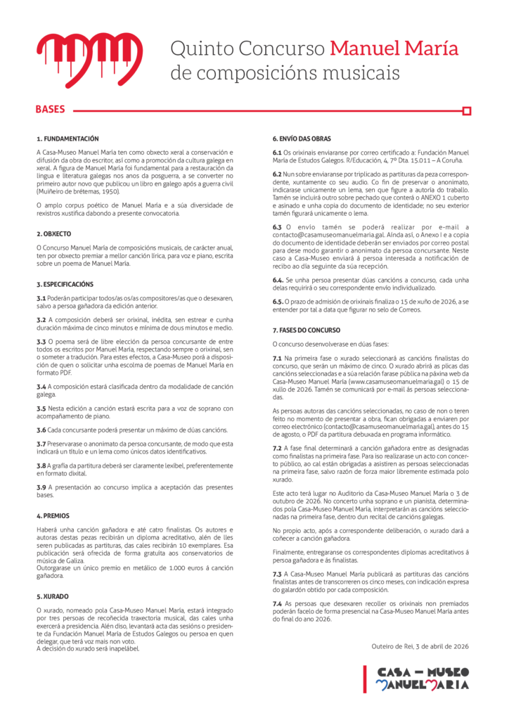 Os Premios Follas Novas 2026 distinguirán obras publicadas entre o 1 de decembro de 2024 e o 30 de novembro de 2025, en papel ou en formato dixital, sempre que estean editadas orixinalmente en lingua galega e integradas na cadea comercial do libro galego. En total, outorgaranse 13 premios sometidos á valoración do xurado, aos que se suman tres galardóns honoríficos que recoñecen a traxectoria dun Escritor ou Escritora Galego/a Universal, o labor dunha libraría e a contribución á edición galega, outorgados directamente polas entidades convocantes.