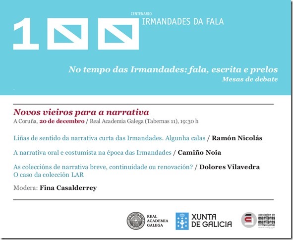 O martes 20 de decembro, ás 19:30 horas, na Real Academia Galega (Rúa Tabernas), na Coruña, terá lugar a mesa de debate Novos vieiros para a narrativa, coa que a Real Academia Galega finaliza o ciclo No tempo das Irmandades: fala, escrita e prelos.