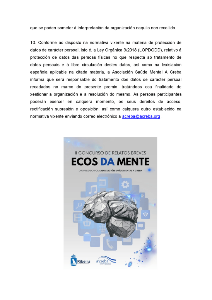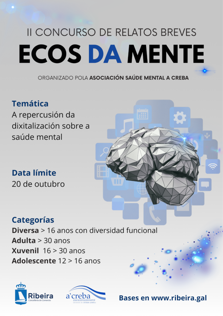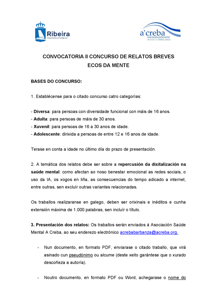 Esta entrada foi publicada en Premios Literatura Xuvenil, Premios narrativa: convocatorias e etiquetada Asociación Saúde Mental A Creba, Concello de Ribeira, Concurso de Relatos Breves Ecos da Mente por asociacionescritoras-es. Marca a ligazón permanente.