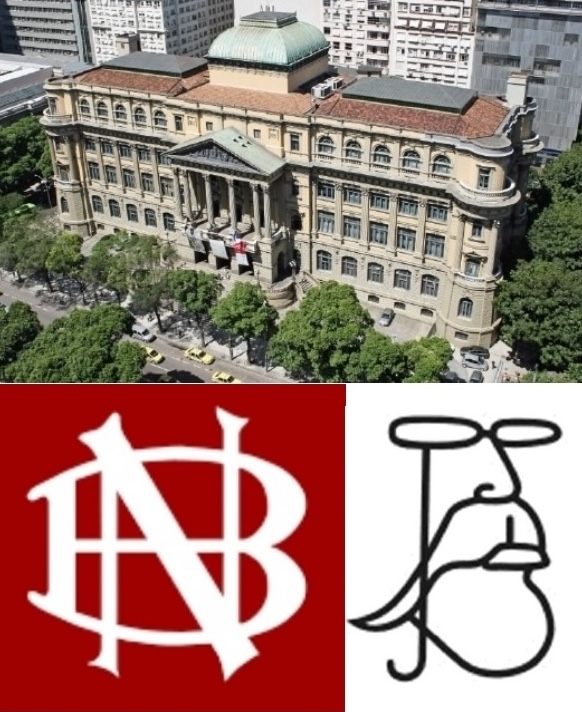[Edificio e logo da Biblioteca Nacional de Rio de Janeiro / Caricatura de Machado de Assis]