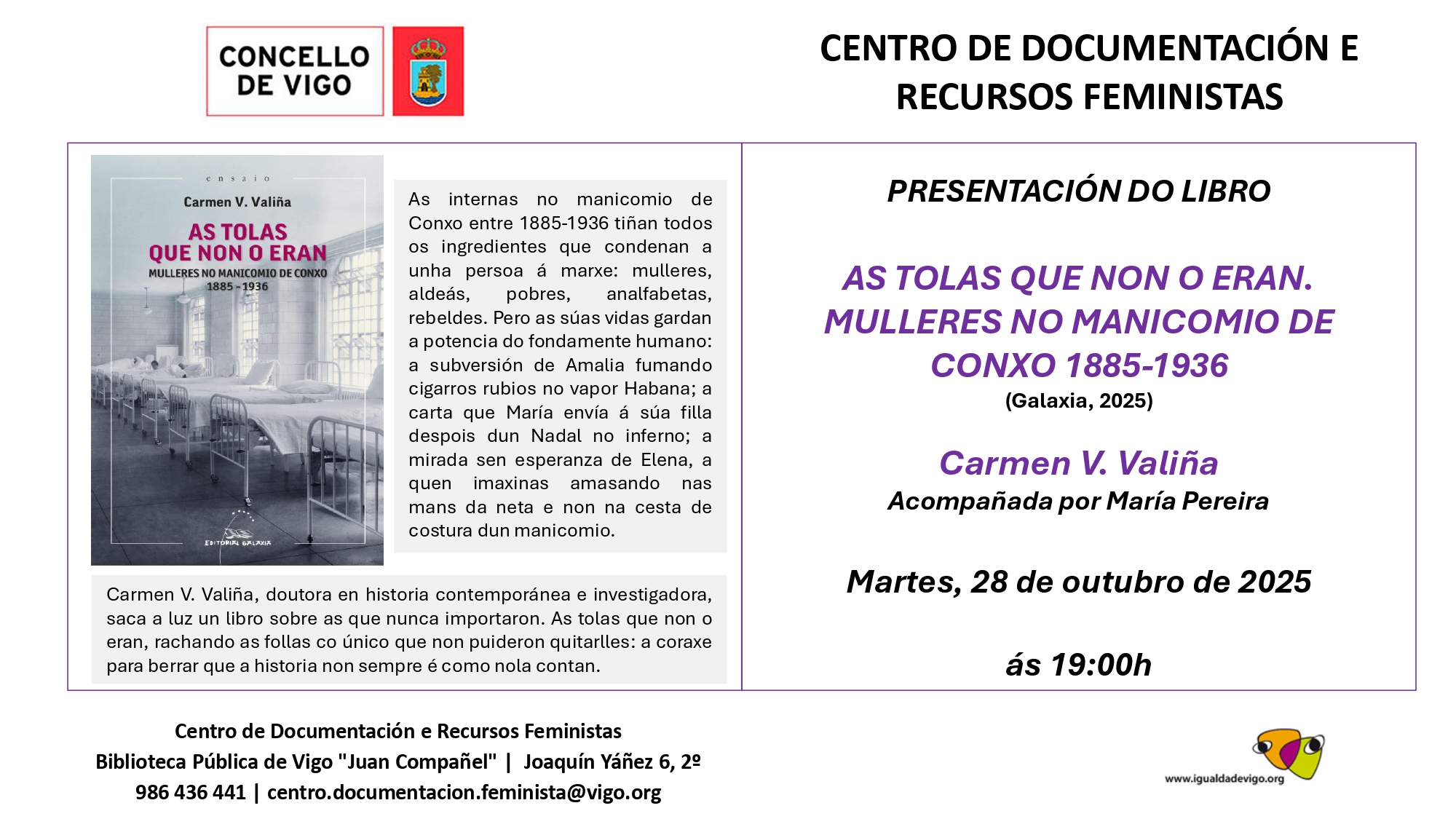 Esta entrada foi publicada en Divulgación, Historia, Presentacións de libros, Sociedade e etiquetada As tolas que non o eran, Carmen V. Valiña, Centro de Documentación e Recursos Feministas do Concello de Vigo, Concello de Vigo, Editorial Galaxia, María Pereira por asociacionescritoras-es. Marca a ligazón permanente.