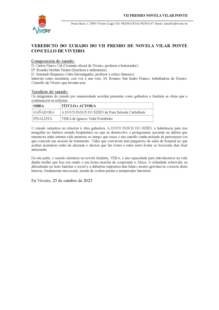 Veredicto do xurado do VII Premio de Novela Vilar Ponte do Concello de Viveiro