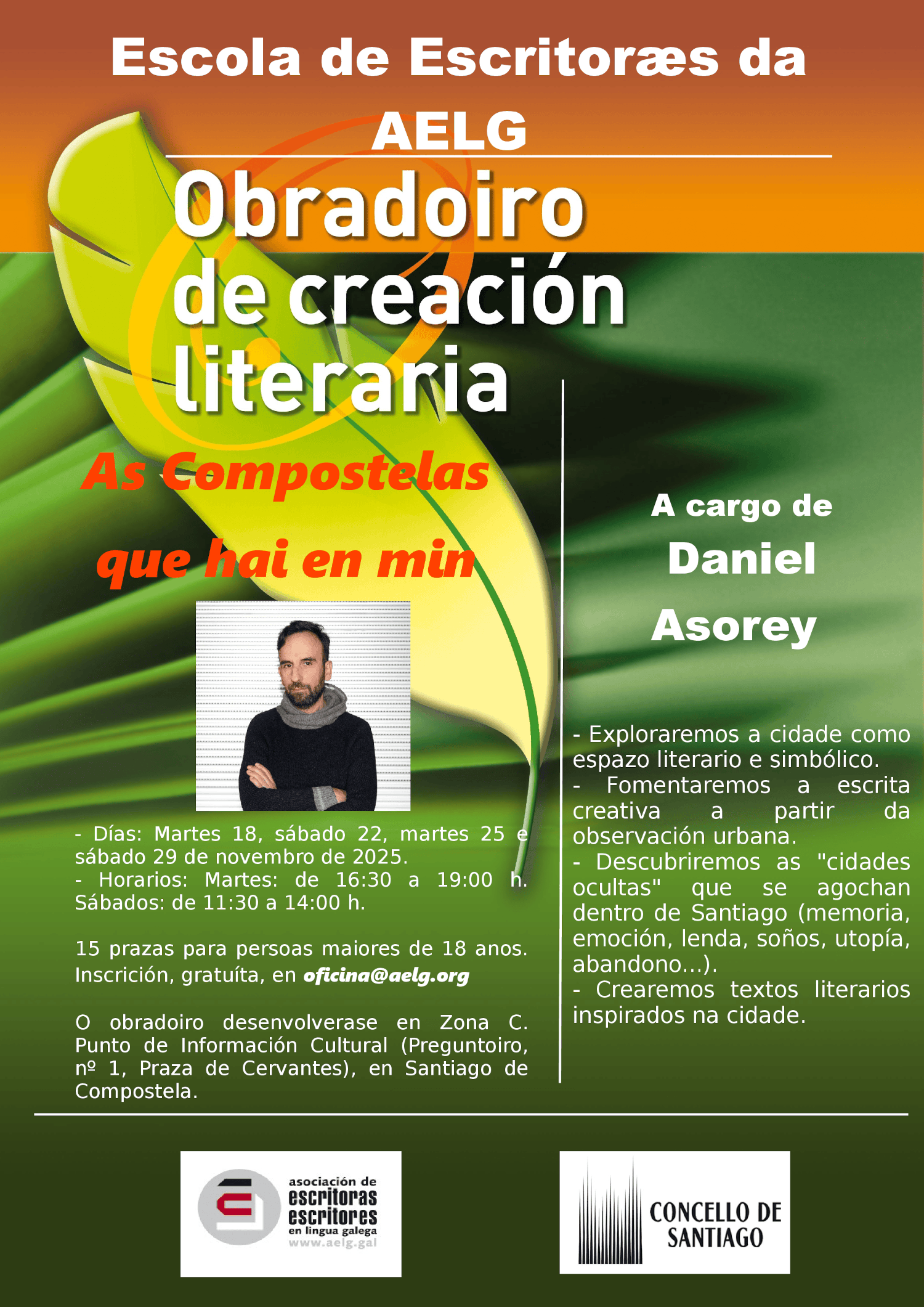 O Obradoiro de creación literaria As Compostelas que hai en min, impartido por Daniel Asorey, é unha iniciativa da Escola de Escritoræs da AELG, co apoio do Concello de Santiago de Compostela.