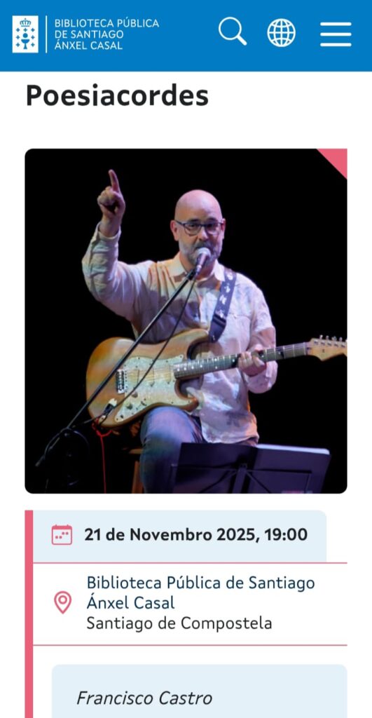 Esta entrada foi publicada en Música, Poesía, Recitais e etiquetada Biblioteca Ánxel Casal de Santiago, Francisco Castro, Poesiacordes por asociacionescritoras-es. Marca a ligazón permanente.