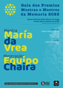 A Gala dos Premios Mestras e Mestres da Memoria 2025 foi unha actividade da Sección de Literatura de Tradición Oral da AELG, co apoio da Área de Cultura, Turismo e Promoción da Lingua do Concello de Lugo. A Sección de Literatura de Tradición Oral da AELG, previa deliberación do Grupo de Traballo composto por Ana Acuña, Félix Castro Vicente, Carme Pernas Bermúdez, Calros Solla, Xurxo Souto, Cesáreo Sánchez Iglesias, Xosé Manuel Varela, Lois Pérez e Antonio Reigosa, propuxo ao Consello Directivo da Asociación de Escritoras e Escritores en Lingua Galega recoñecer como Mestra e Mestras/es da Memoria 2025 respectivamente a María da Vrea e ao Equipo Chaira, polas súas achegas á mesma ao longo das súas vidas, contribuíndo así a manter viva unha parte fundamental da nosa memoria colectiva e o saber popular.
