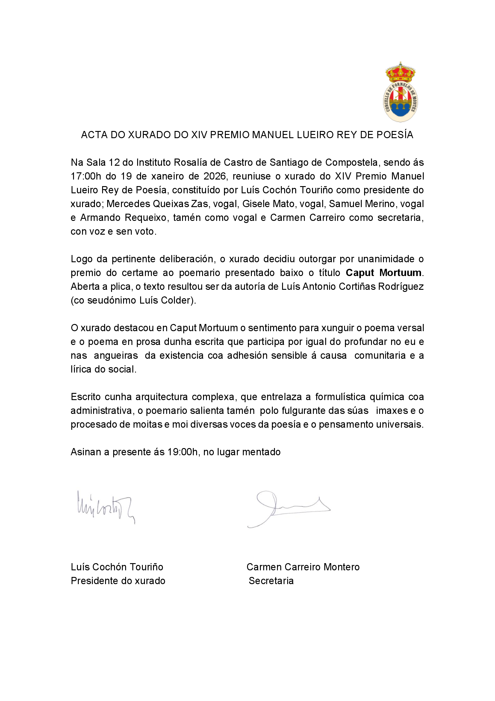 Acta do xurado do XIV Premio Manuel Lueiro Rey de Poesía