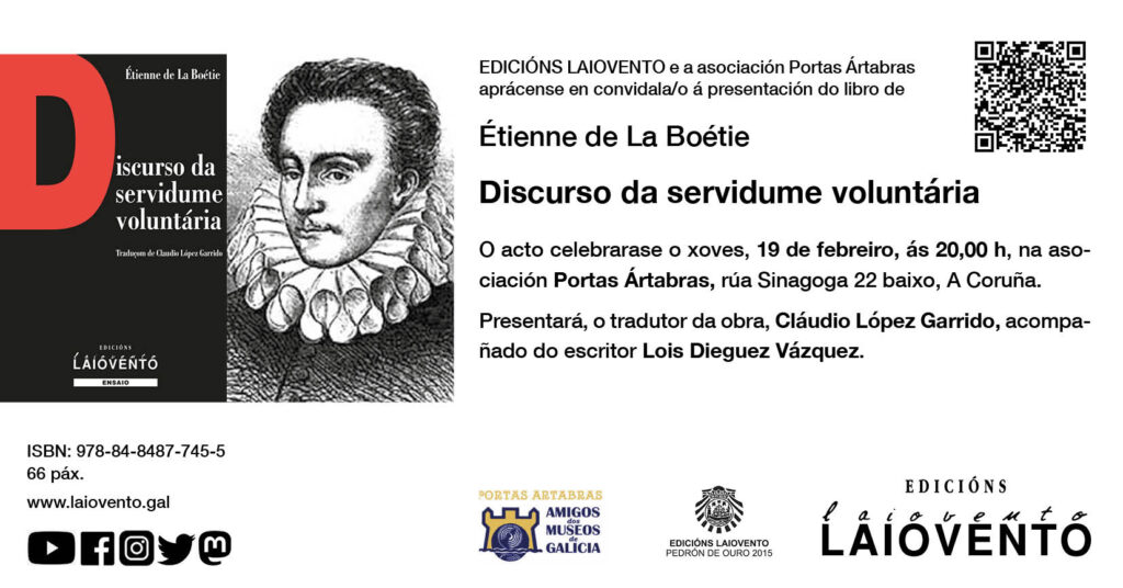 Esta entrada foi publicada en Ensaio, Presentacións de libros, Tradución e etiquetada Asociación de Amigos dos Museos de Galicia, Cláudio López Garrido, Discurso da servidume voluntária, Edicións Laiovento, Étienne de La Boétie, Lois Diéguez, Portas Ártabras por asociacionescritoras-es. Marca a ligazón permanente.