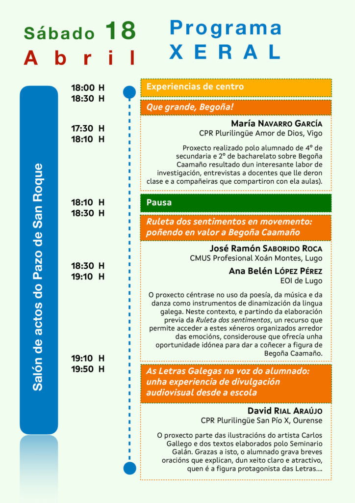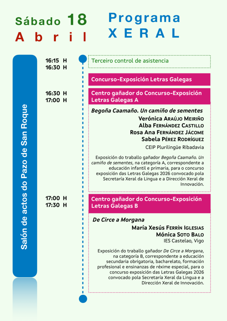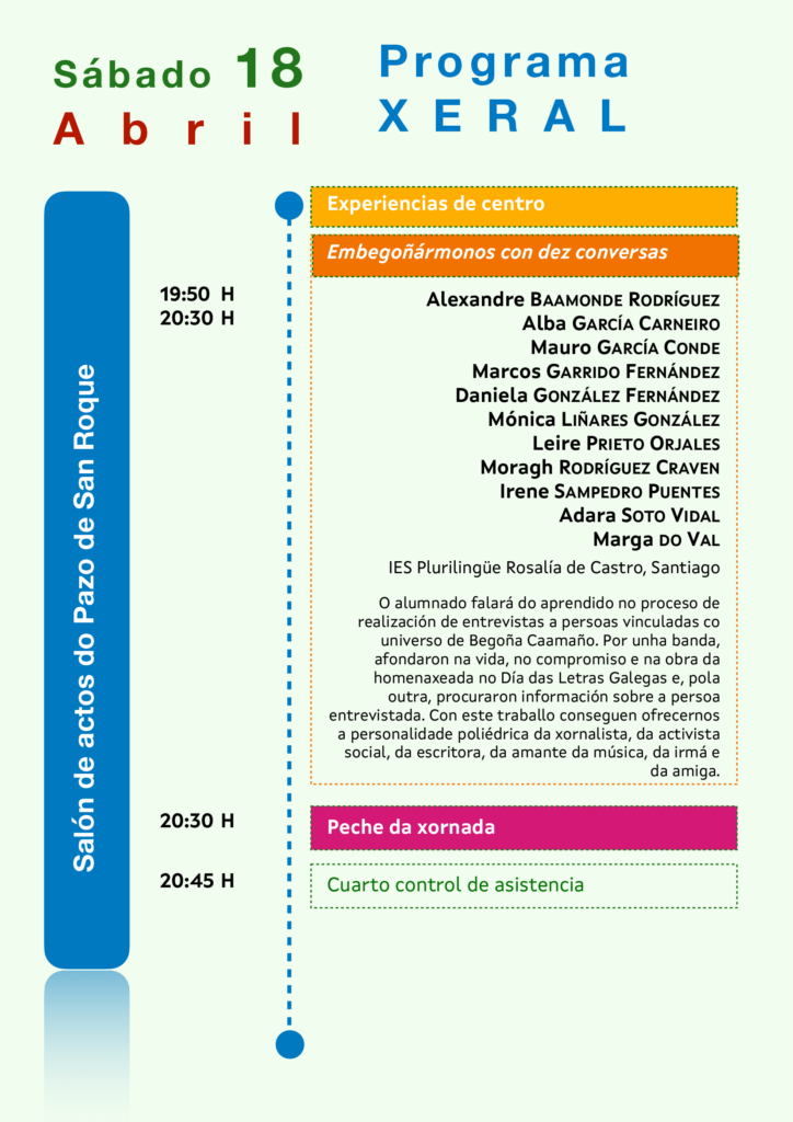 Esta entrada foi publicada en Encontros e Xornadas, Literatura e ensino, Música, Narrativa, Palestras e etiquetada Adara Soto Vidal, Alba Fernández Castillo, ALba García Carneiro, Alexandre Baamonde Rodríguez, Ana Belén López Pérez, Ana Isabel Boullón Agrelo, Beatriz Caamaño Rascado, Beatriz Maceda Abeleira, Begoña Caamaño, Daniela González Fernández, David Rial, Irene Sampedro Fuentes, José Ramón Saborido Roca, Leire Prieto Orjales, Marcos Garrido Fernández, Marga do Val (Marga Romero), María López Sández, María Navarro García, María Xesús Ferrín Iglesias, Mauro García Conde, Mónica Liñares González, Mónica Soto Balo, Moragh Rodríguez Craven, Ramón Nicolás, Rosa Ana Fernández Jácome, Sabela Pérez Rodríguez, Secretaría Xeral da Lingua, Uxía, Valentín García Gómez, Verónica Araújo Meiriño, Xunta de Galicia por asociacionescritoras-es. Marca a ligazón permanente.