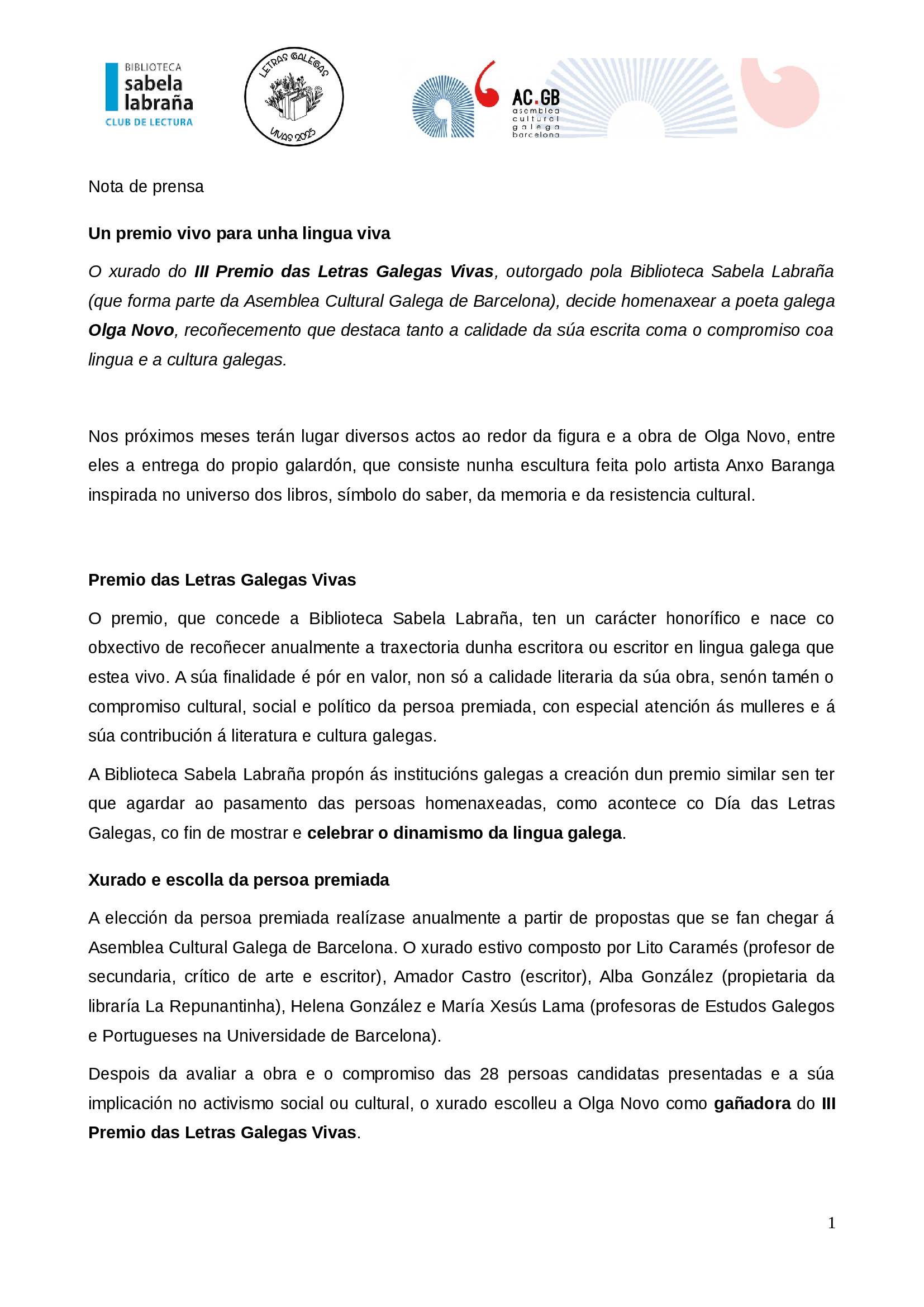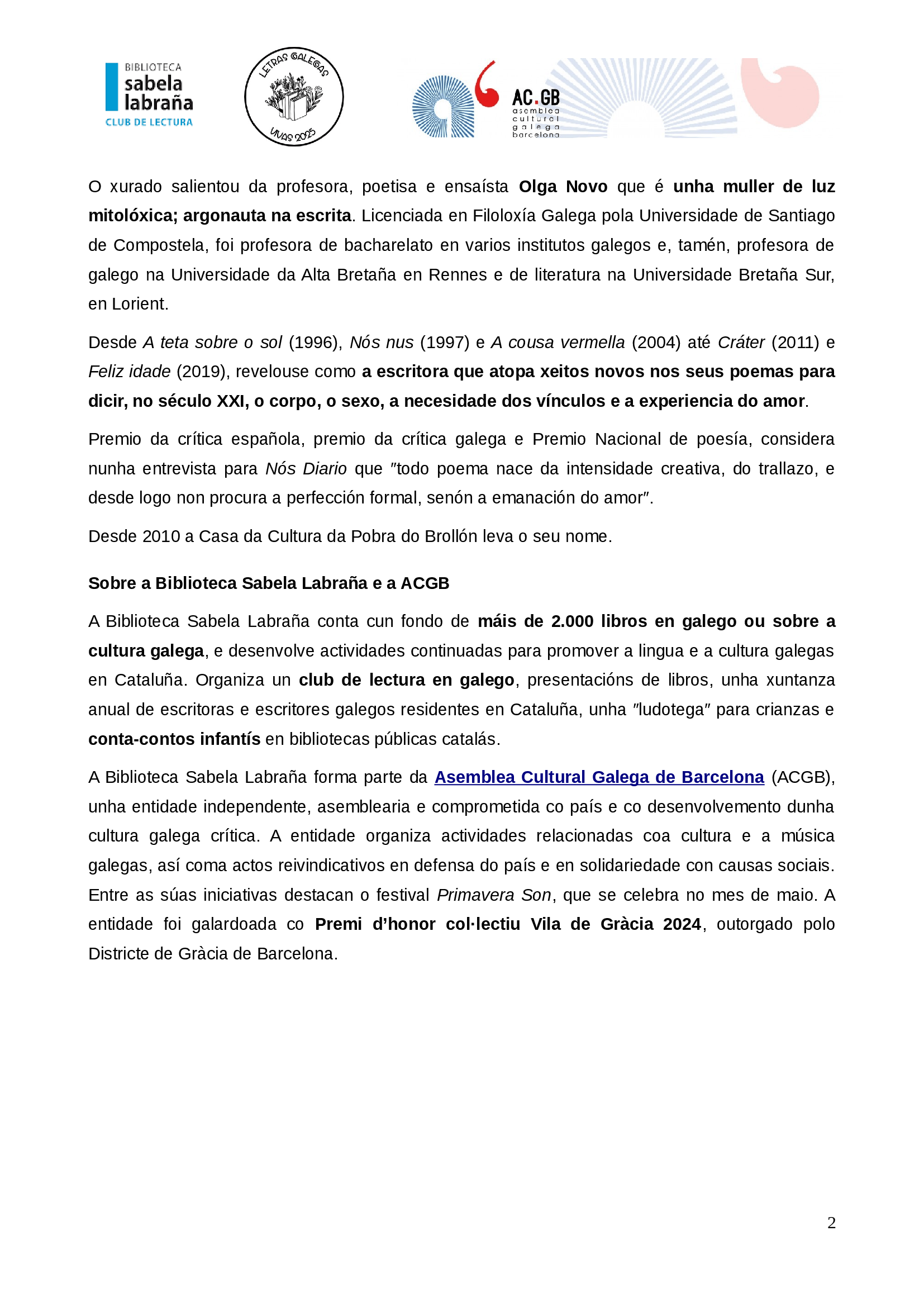 Olga Novo gaña o III Premio das Letras Galegas Vivas
