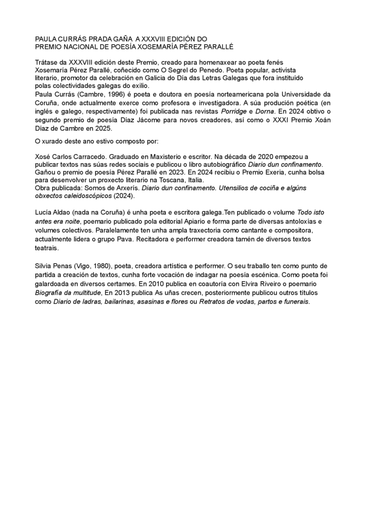 Paula Currás Prada gaña a XXXVIII edición do Premio Nacional de Poesia Xosemaría Pérez Parallé