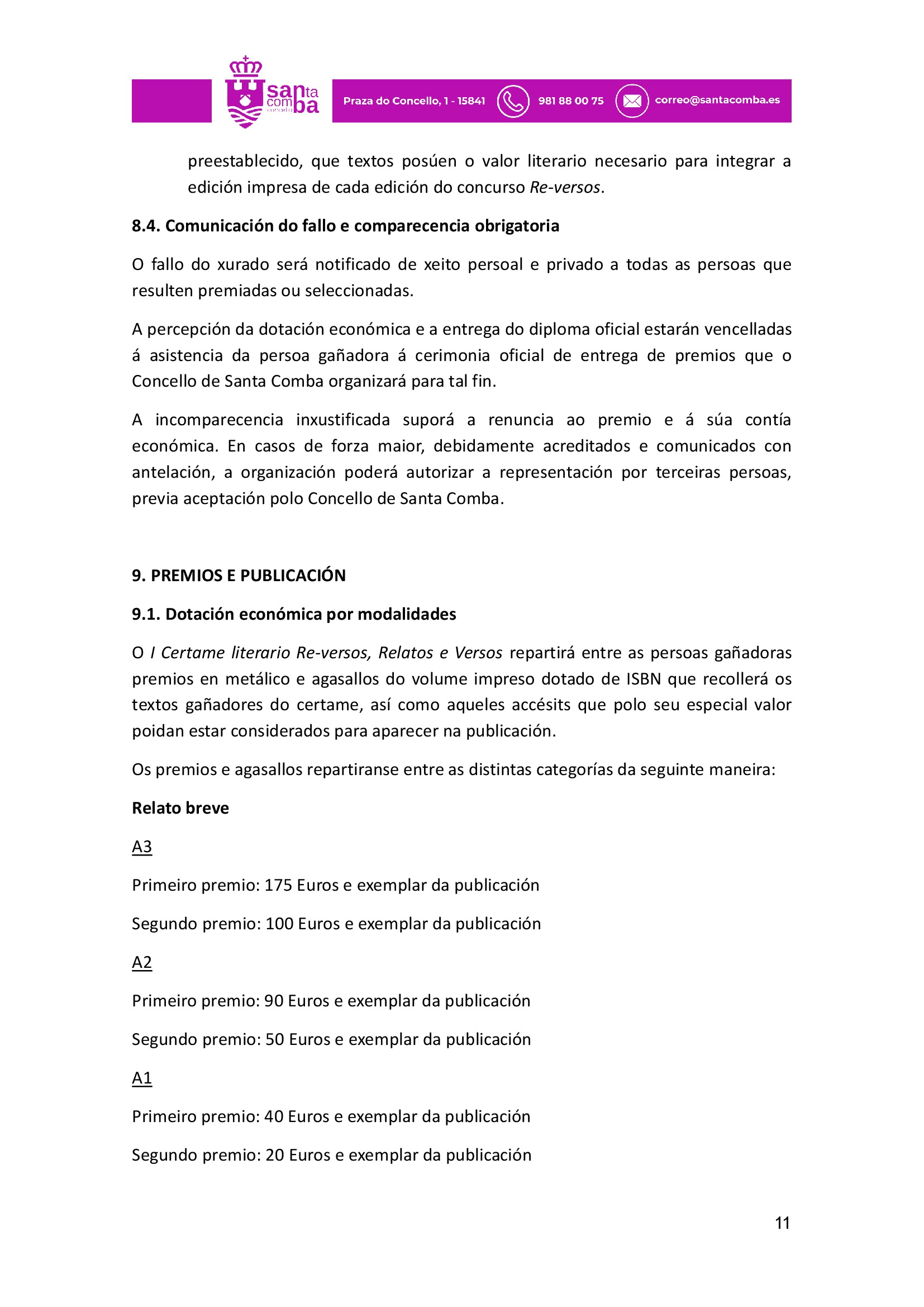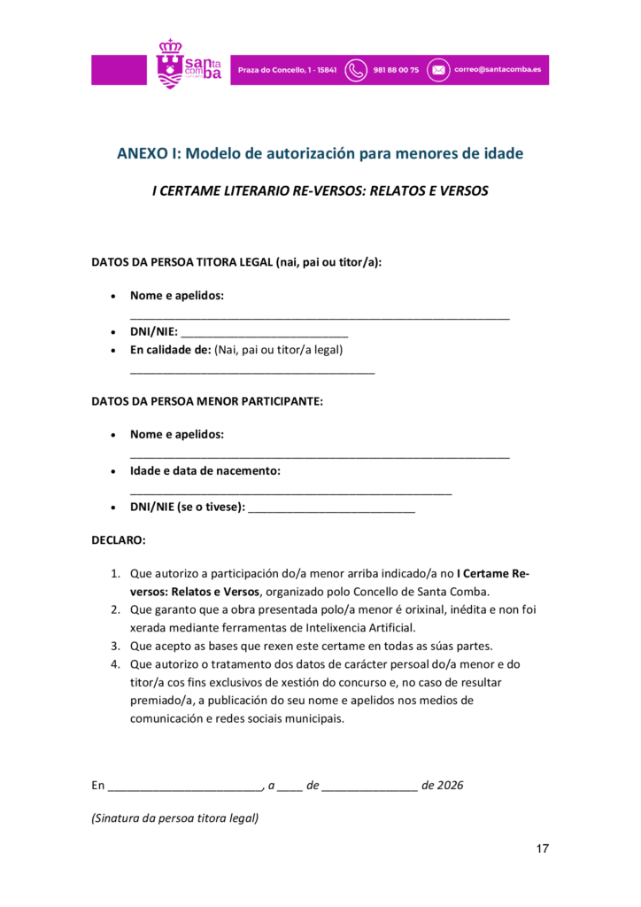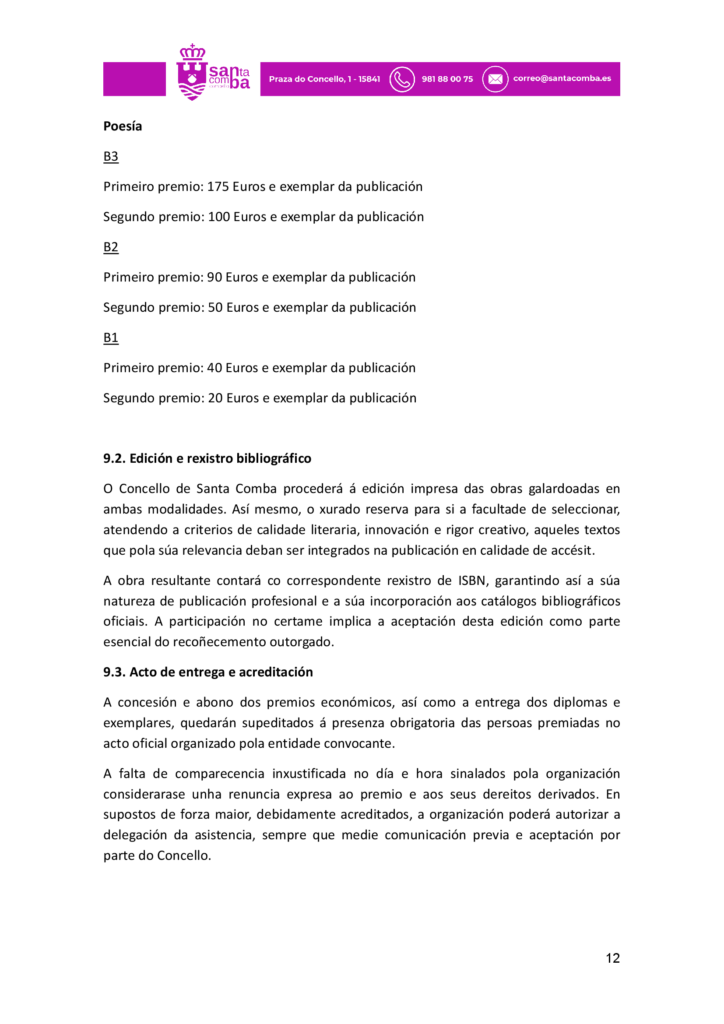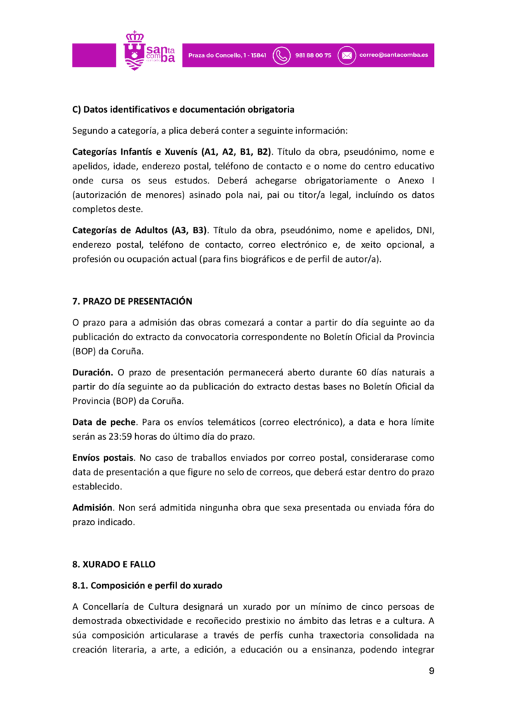 Publicado en Premios Literatura Infantil, Premios Literatura Xuvenil, Premios narrativa: convocatorias, Premios poesía: convocatorias | Etiquetado Certame Literario de relatos e versos Reversos de Santa Comba, Concello de Santa Comba
