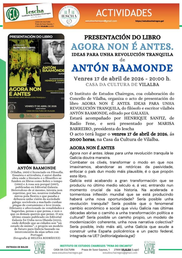 “O escritor Antón Baamonde presenta o seu novo libro, Agora non é antes, unha obra que, máis que ollar ao pasado, fai unha prospección de futuro para entender o presente. Baamonde alerta sobre unha época de “tormenta” onde o mercado está a “arrasar toda a densidade cultural”. Sinala que a intelixencia artificial está a privatizar a herdanza cultural do planeta, e que moitos produtores culturais crean xa só coa vista posta no éxito de mercado inmediato, perdendo de vista a transcendencia futura.