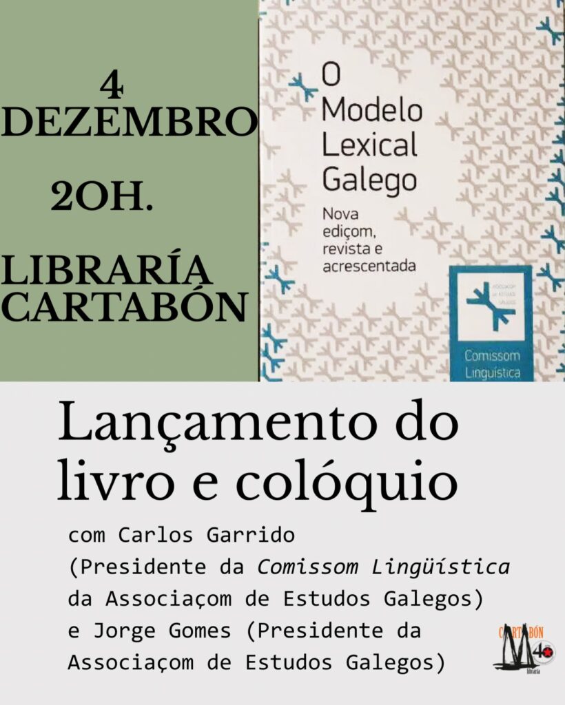 Publicado en Divulgación, Lingua, Presentacións de libros | Etiquetado Associaçom de Estudos Galegos, Carlos Garrido, Jorge Gomes, Libraría Cartabón, O Modelo Lexical Galego
