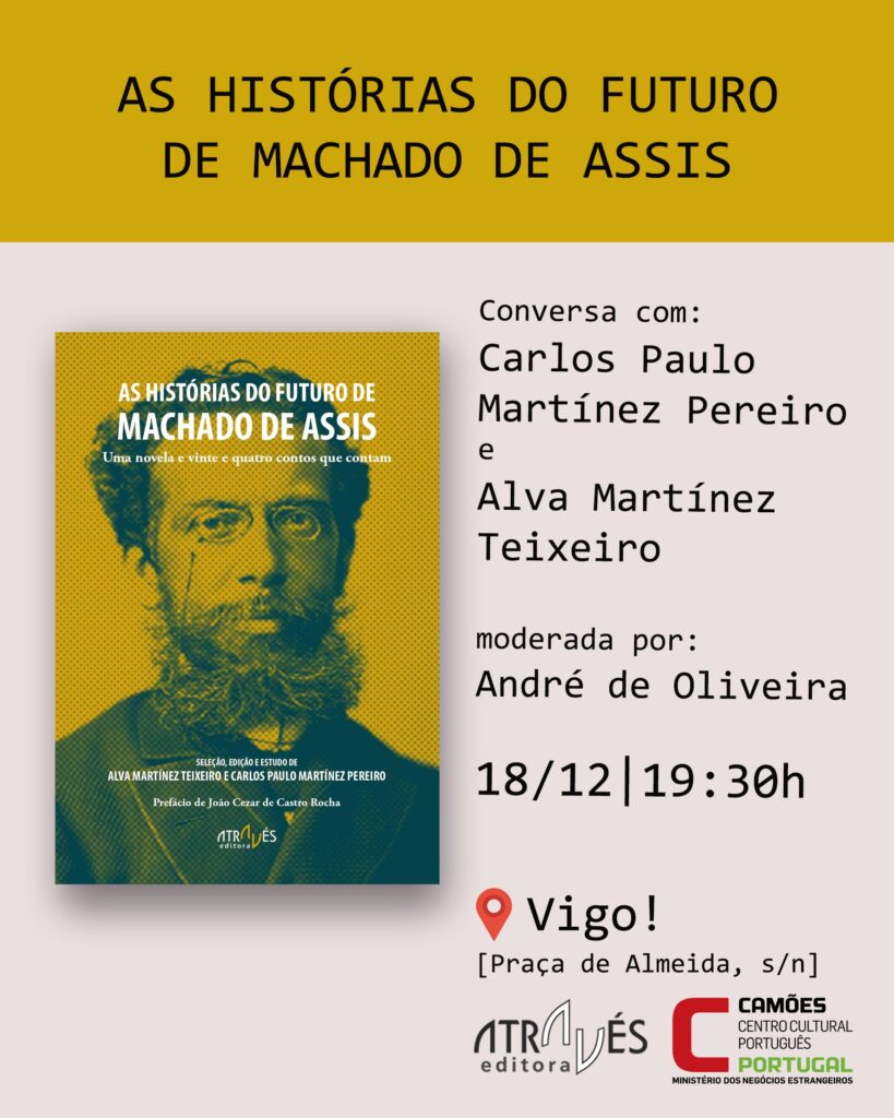 Publicado en Coloquios, Lusofonía, Narrativa, Presentacións de libros | Etiquetado Alva Martínez Teixeiro, André de Oliveira, As histórias do futuro de Machado de Assis. Uma novela e vinte e quatro contos que contam, Através Editora, Camões-Centro Cultural Portugués em Vigo, Carlos Paulo Martínez Pereiro