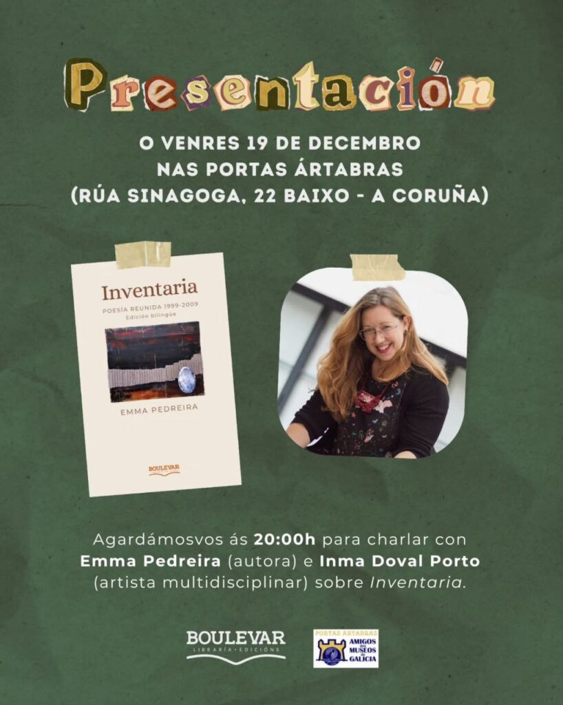 Publicado en Coloquios, Poesía, Presentacións de libros | Etiquetado Asociación de Amigos dos Museos de Galicia, Emma Pedreira, Inma Doval Porto, Inventaria, Libraría Boulevar (Bueu), Portas Ártabras