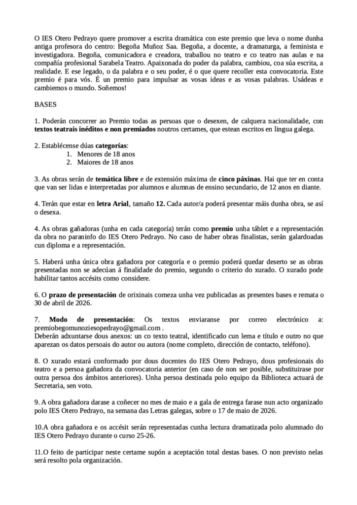 2. As OBRAS serán de temática e extensión libre, se ben hai que ter en conta que van ser lidas e interpretadas por alumnos e alumnas de ensino secundario, de 12 anos en diante.