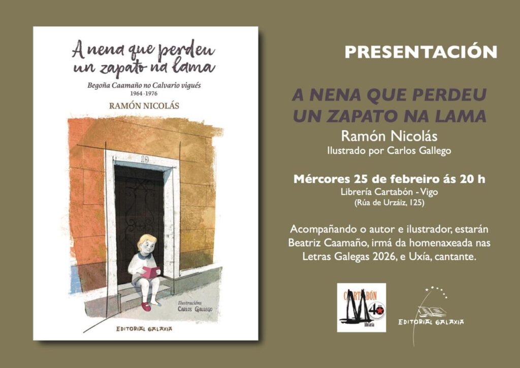 Publicado en Biografías, Ilustración, Presentacións de libros | Etiquetado A nena que perdeu un zapato na lama. Begoña Caamaño no Calvario vigués 1964-1976, Begoña Caamaño, Carlos Gallego, Editorial Galaxia, Libraría Cartabón, Ramón Nicolás, Uxía