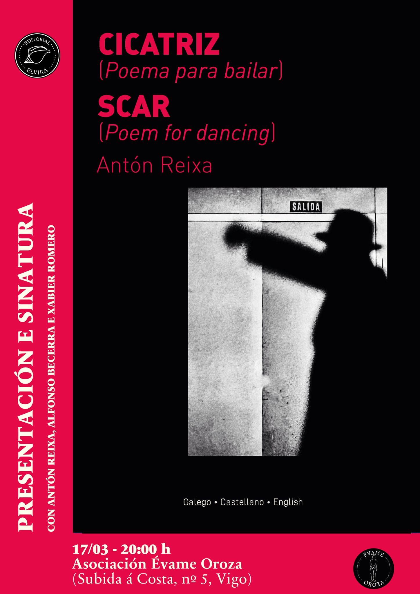 Publicado en Poesía, Presentacións de libros | Etiquetado Afonso Becerra de Becerreá, Antón Reixa, Asociación Cultural Évame Oroza, Cicatriz (Poema para bailar), Editorial Elvira, Xabier Romero