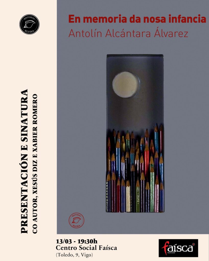 Publicado en Narrativa, Presentacións de libros | Etiquetado Antolín Alcántara Álvarez, Centro Social Faísca (Vigo), Editorial Elvira, En memoria da nosa infancia, Xabier Romero, Xesús Diz