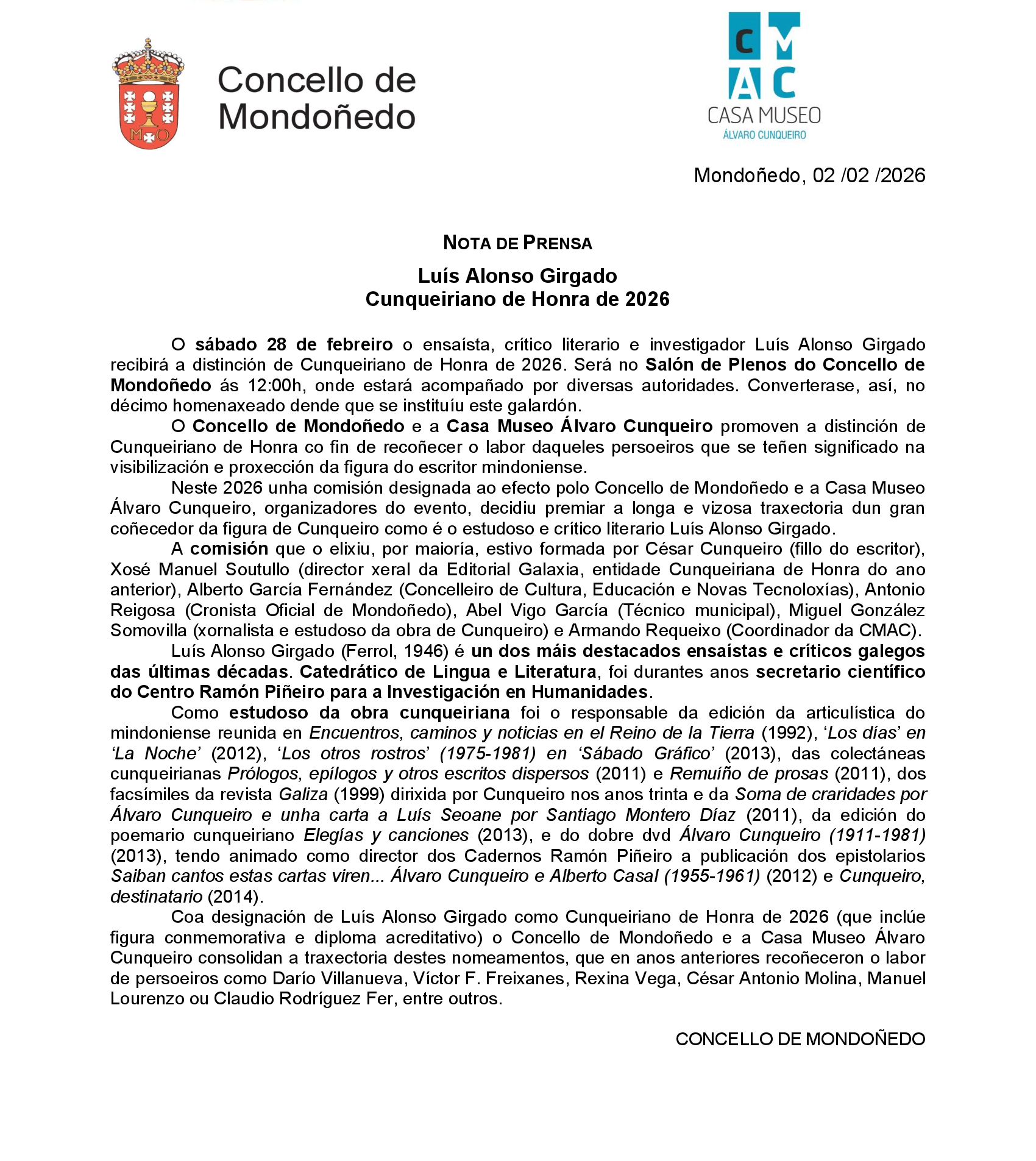 Luís Alonso Girgado, Cunqueiriano de Honra de 2026