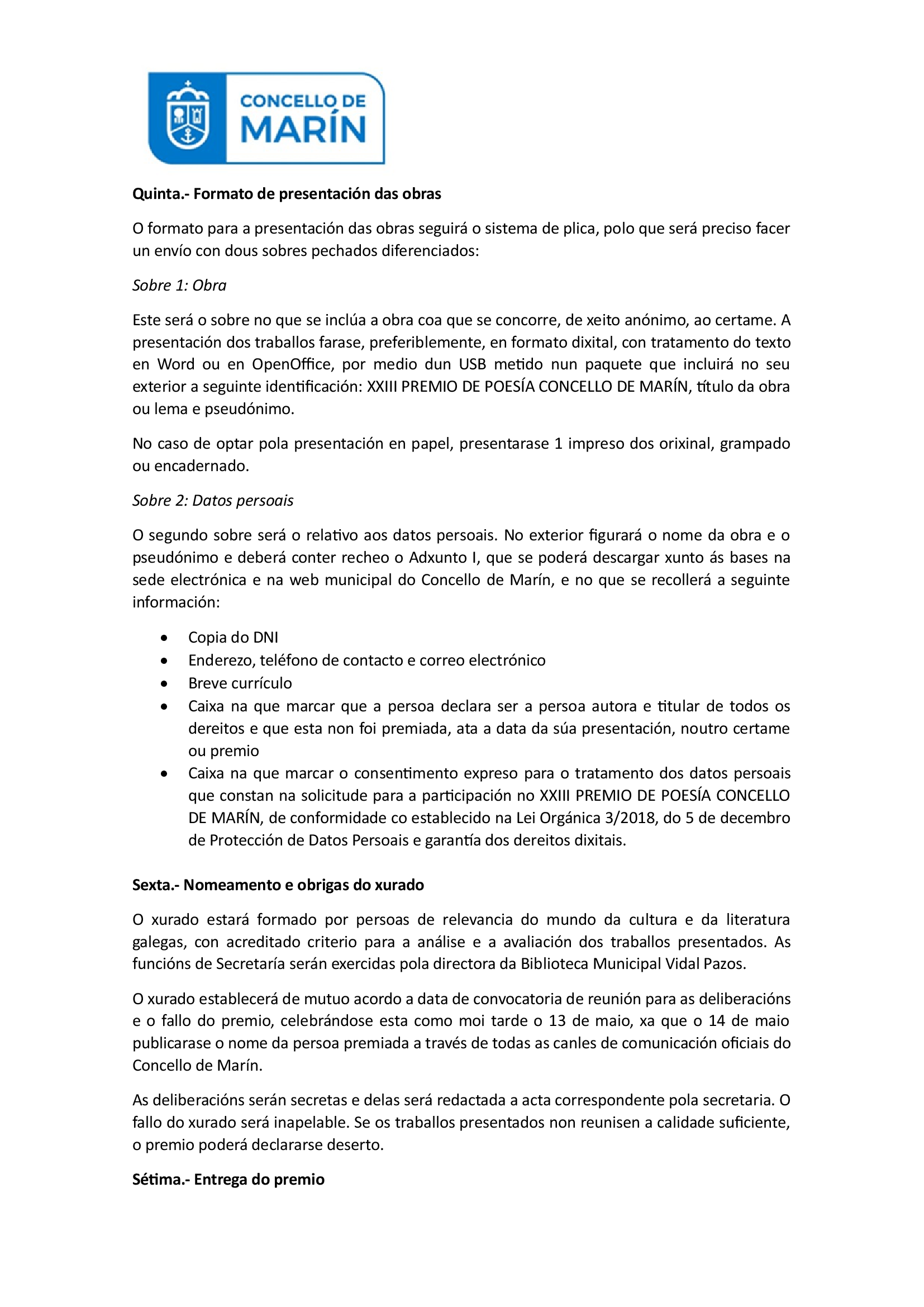 Ademais, o xurado, escolleu como finalista, a obra presentada baixo o lema Todo o que fixemos aquela noite. Aberta a plica, o texto resultou ser da autoría de Irene Rega Jul.