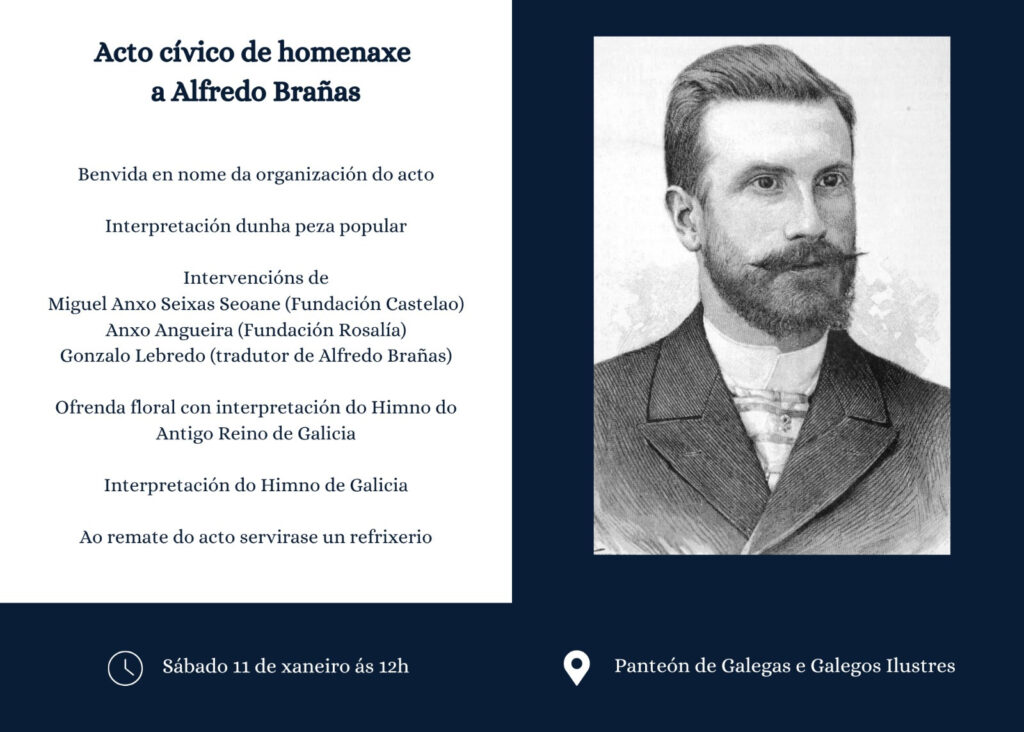 “Ás dez da mañá do 11 de xaneiro de 1859 viña ao mundo un dos persoeiros máis emblemáticos da intelectualidade galega da segunda metade do século XIX: Alfredo José Francisco Higinio Brañas Menéndez, Alfredo Brañas, gran teórico e promotor do Rexionalismo galego.
