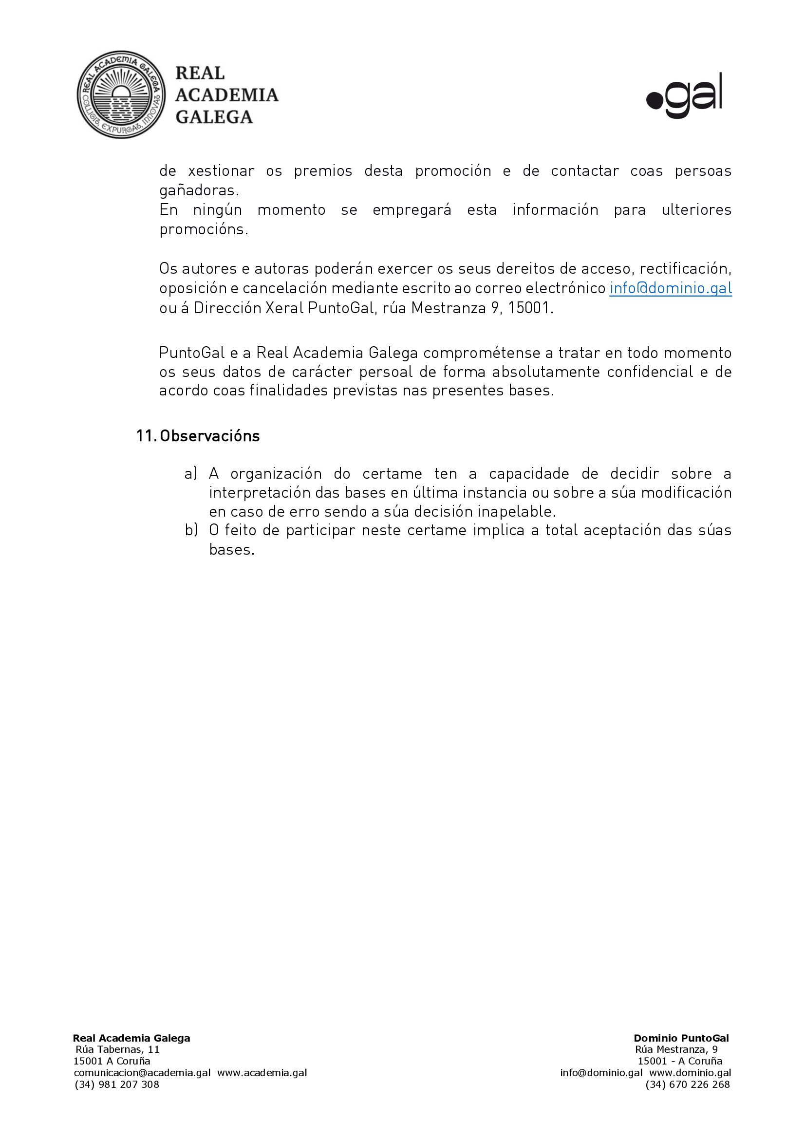 “O VIII Concurso de microrrelatos que organizan a Real Academia Galega e PuntoGal xa ten gañadores. Lugo, Barcelona e Varsovia son os lugares desde onde participaron as tres persoas premiadas na categoría de adultos: Santiago Argüeso Galván (1997), gañador do primeiro galardón, e Damián Fernández Rodríguez (1986) e Rebeca Lema Martínez (1986), que se fixeron co segundo e o terceiro, respectivamente. Na modalidade xuvenil os dous primeiros premios son para as veciñas de Guitiriz Yanira Ansede Iglesias (2008) e Mencía Rodríguez Lorenzo (2009). O terceiro, para a coruñesa María Conde Alba (2008). Da Coruña é tamén Ana López Canosa (2013), gañadora do primeiro da categoría infantil, na que Laura Álvarez Barrio (2013), veciña de Redondela, conseguiu o segundo e a luguesa Irene Suárez Rodríguez (2015) o terceiro.