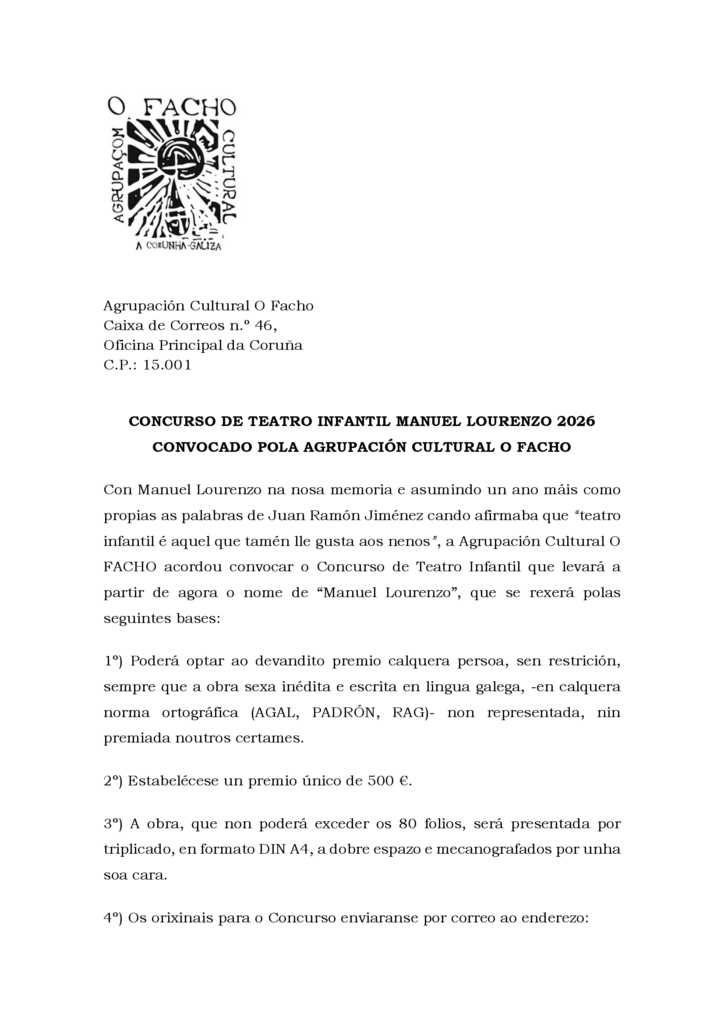 como próprias as palavras de Juan Ramón Jiménez quando afirmava que “Teatro infantil é aquele que também lhe gosta aos nenos”, a Agrupaçom Cultural O FACHO acordou convocar o Concurso de Teatro Infantil 2022, que se regerá polas seguintes bases: