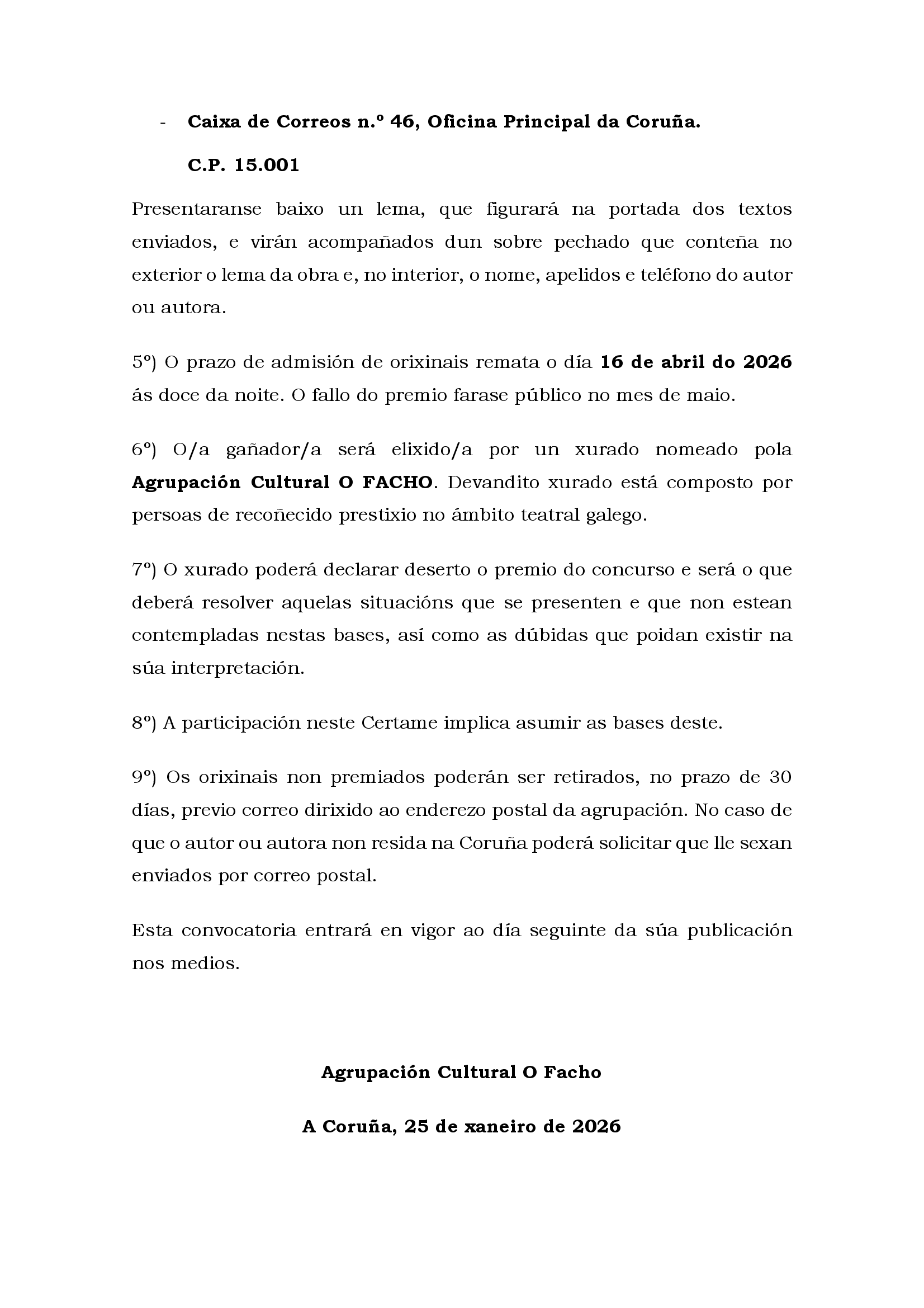 4º) Os originais para o Concurso enviaram-se por correio à Caixa de Correios n.º 46, Oficina Principal d’A Corunha. Apresentaram-se sob um lema, que figurará na portada dos textos enviados, e virám acompanhados de um envelope fechado que contenha no exterior o lema da obra e, no interior, o nome, apelidos, correio electrónico e telefone do autor ou autora.