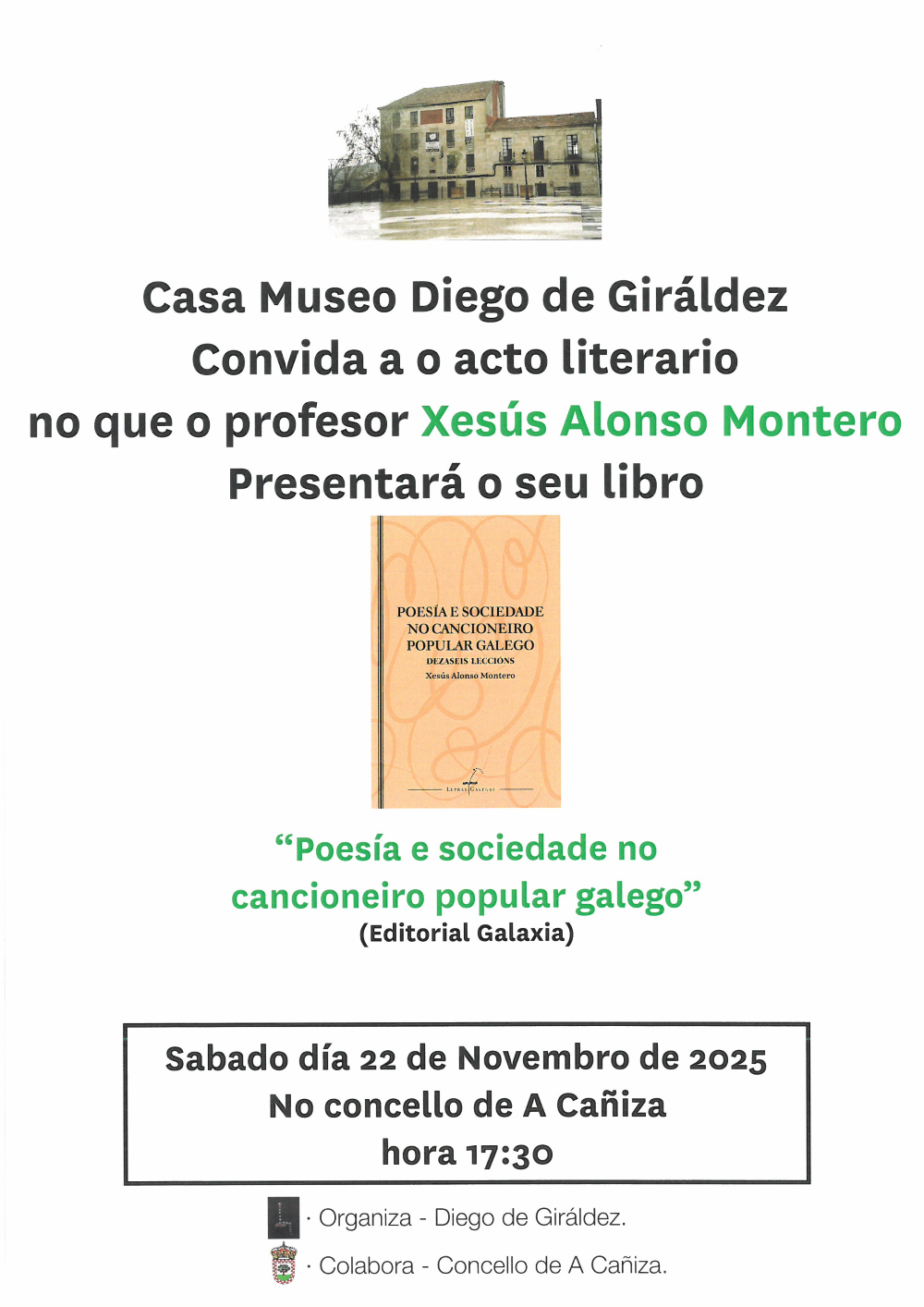 Etiquetado Casa Museo Diego de Giráldez (A Caniza), Concello da Caniza, Editorial Galaxia, Poesía e sociedade no cancioneiro popular galego, Xesús Alonso Montero