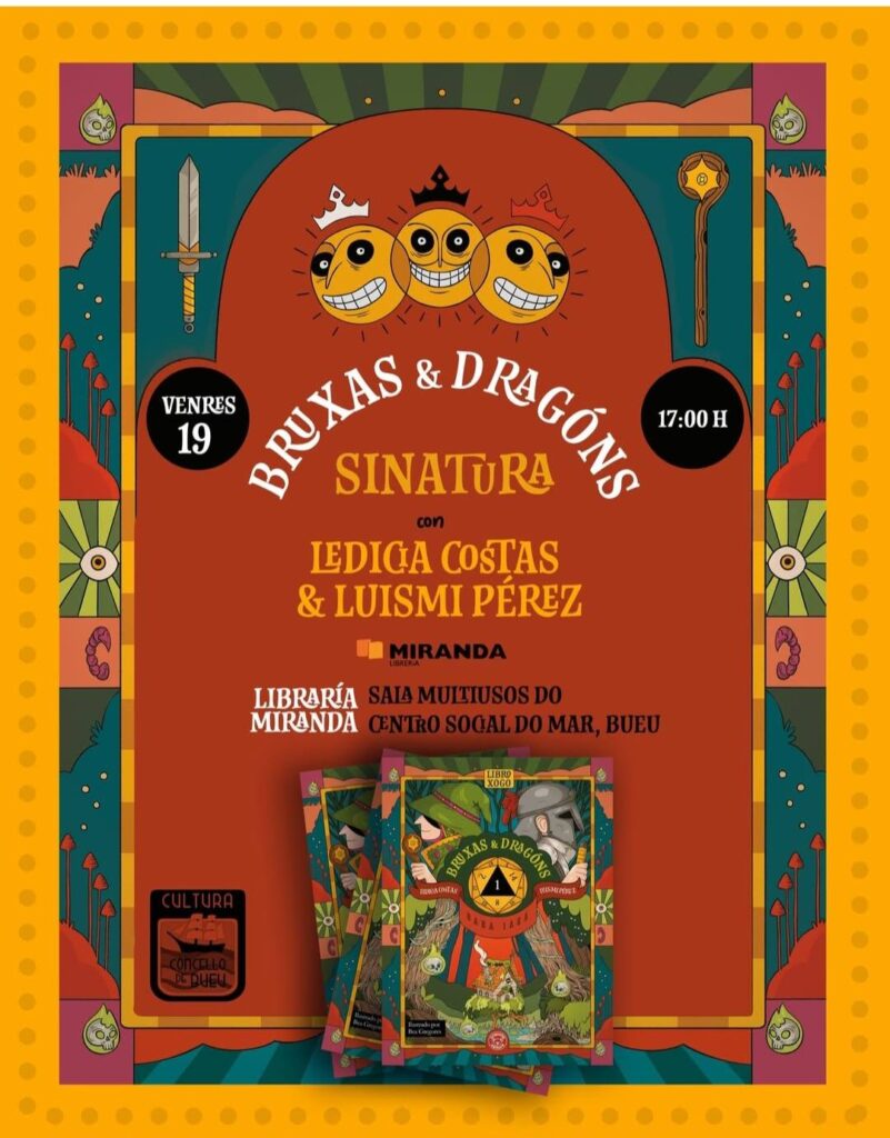Sinatura de Bruxas e Dragóns, de Ledicia Costas e Luismi Pérez, en Bueu