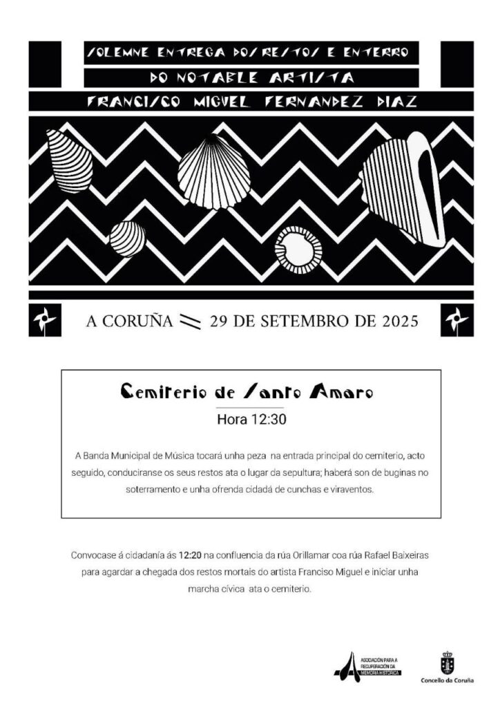 “O 29 de setembro, a Asociación para a Recuperación da Memoria Histórica (ARMH), a Agrupación Cultural Alexandre Bóveda (ACAB), o grupo de investigación sobre Francisco Miguel e Syra Alonso e outras entidades da cidade, coa colaboración do Concello e a Deputación da Coruña, convocan a cidadanía á homenaxe ao artista Francisco Miguel, asasinado polas forzas golpistas en 1936.