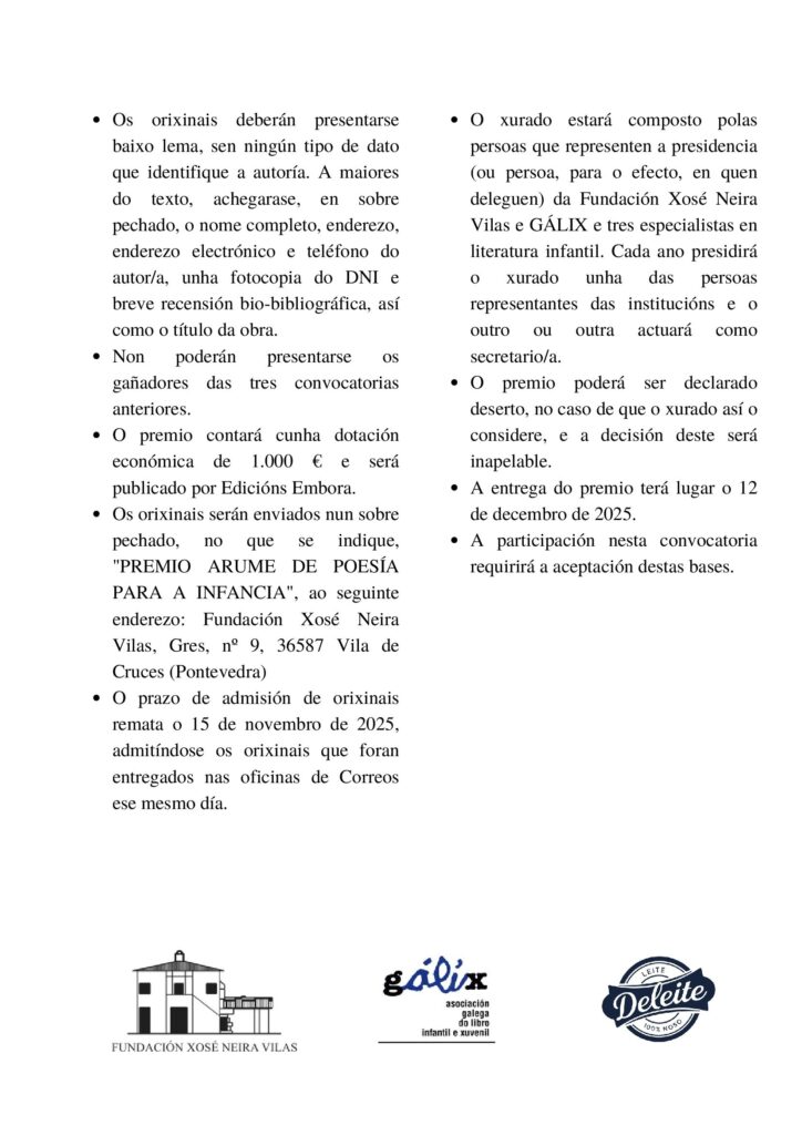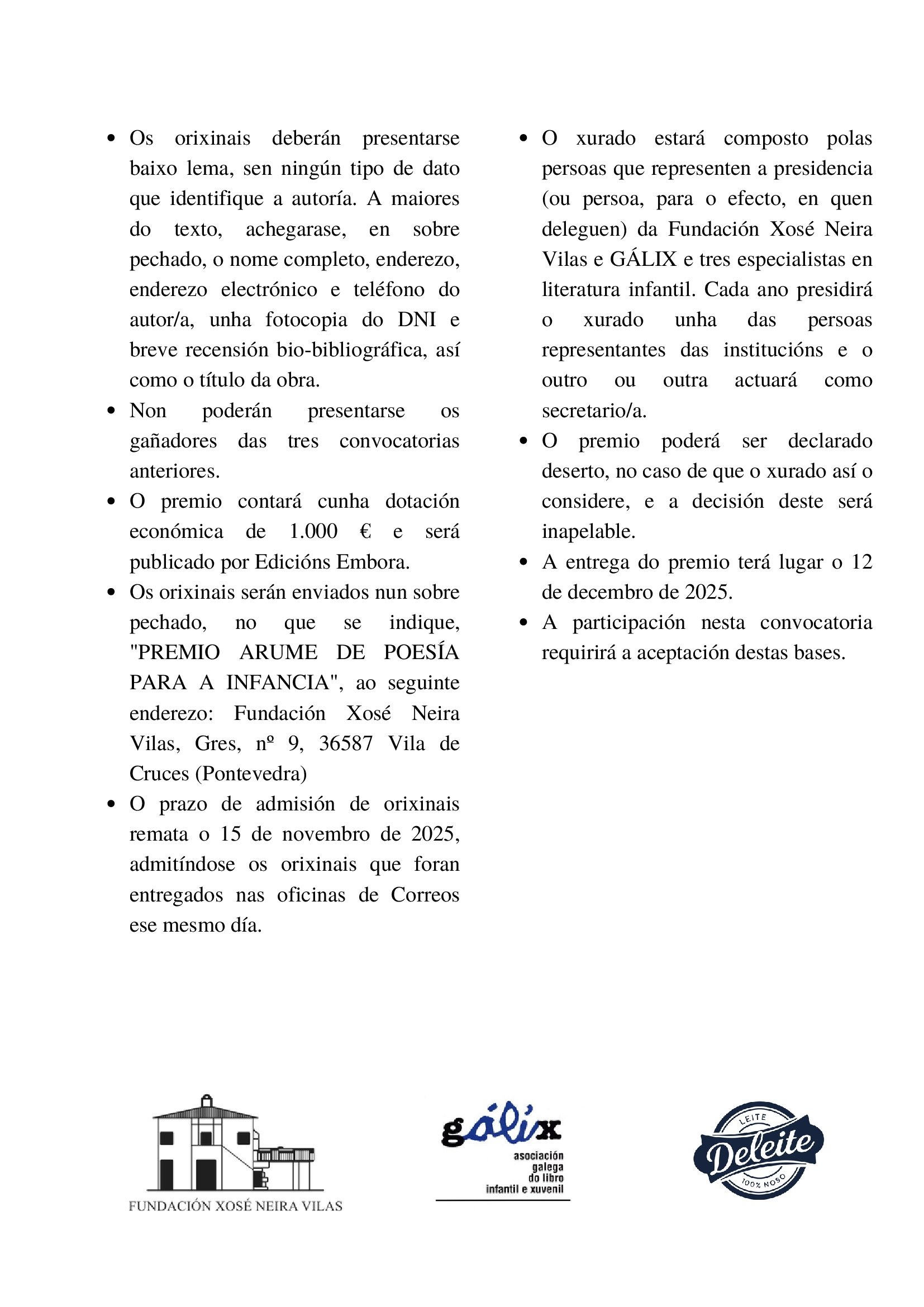 Tamén si, o xurado quere significar e agradecer a implicación tanto da Fundación Xosé Neira Vilas coma da Editorial Galaxia e a Secretaría Xeral da Lingua, ao tempo que recoñece a alta participación no certame, ao que se achegou case unha vintena de orixinais dunha estimable calidade.