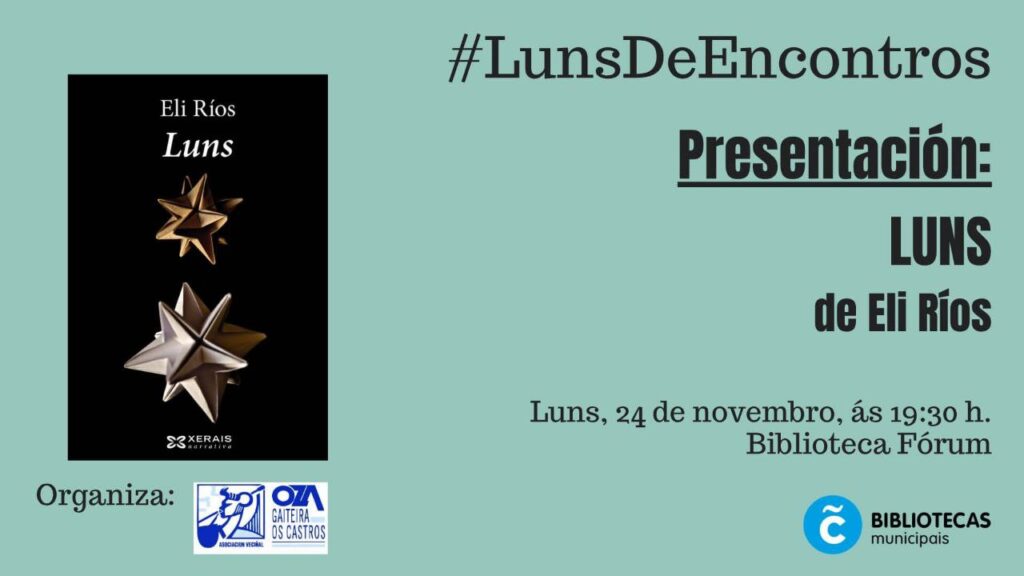 – 21:00 h. Presentación de Luns, de Eli Ríos, publicado por Xerais, coa participación da autora, acompañada por Mercedes Queixas e Goretti Sanmartín.