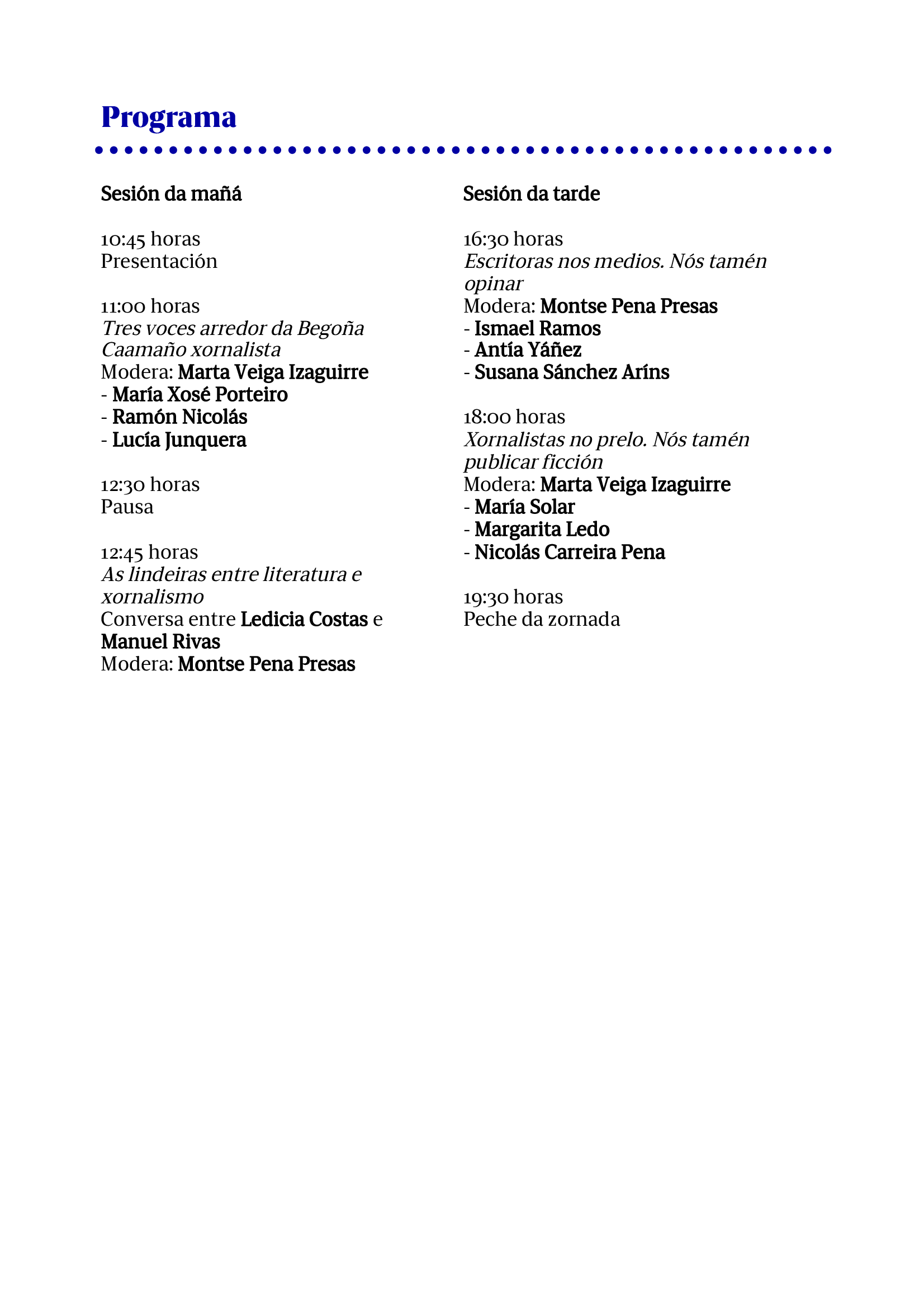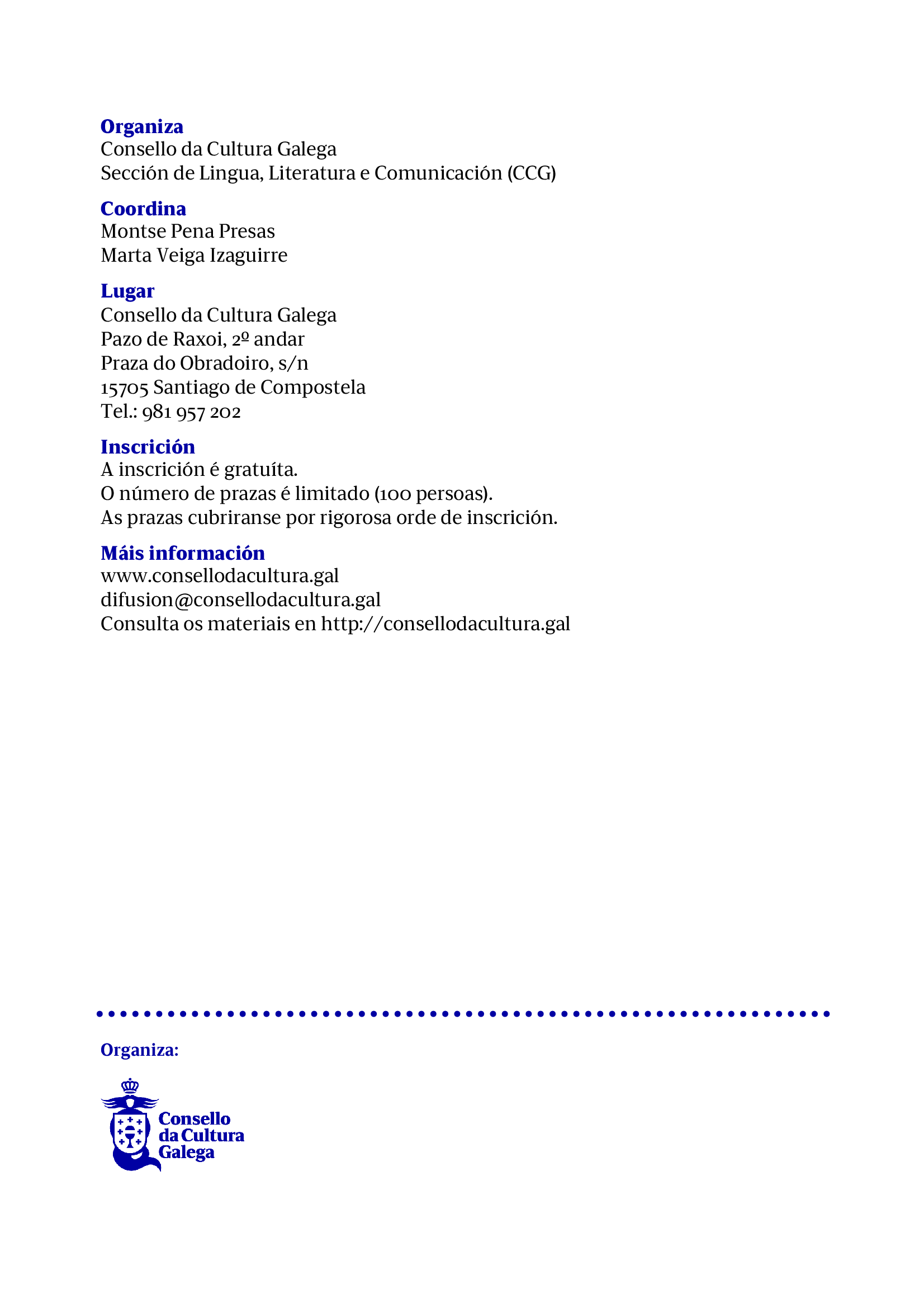 “A Real Academia Galega dedicaralle o Día das Letras Galegas 2026 a Begoña Caamaño (Vigo, 14 de outubro de 1964 – Santiago de Compostela, 27 de outubro de 2014). Así o decidiu a institución no pleno ordinario celebrado esta mañá no pazo municipal de María Pita (A Coruña), unha sesión na que tamén se valoraron as candidaturas de Antón Tovar, Miguel González Garcés e Enrique Labarta Pose. A RAG celebrará a narradora, autora serodia de dúas novelas nas que reescribiu os mitos da Odisea e o artúrico, e mais a xornalista, nun momento en que urxe reconstruír o espazo dun xornalismo para a cidadanía, comprometido coa verdade e co uso do galego. Coa lembranza de Begoña Caamaño, as Letras 2026 serán unha festa asomada á contemporaneidade, á pulsión do presente e á ollada feminista que vertebrou o seu pensamento, o seu traballo intelectual e a súa biografía.