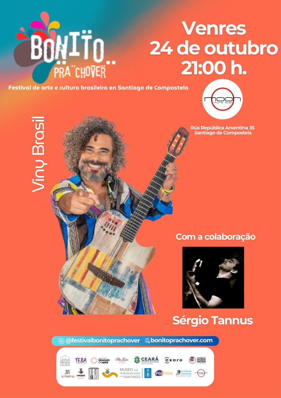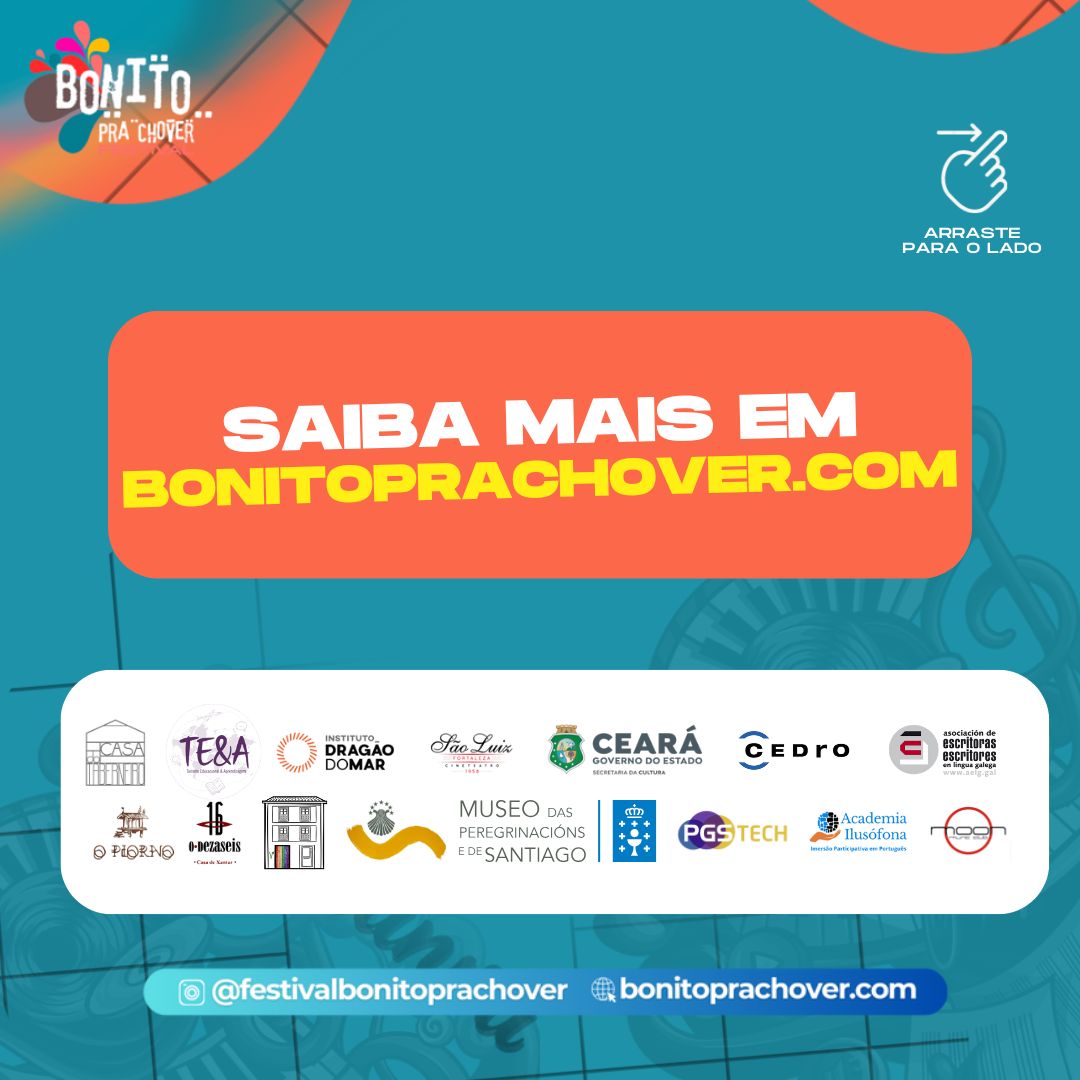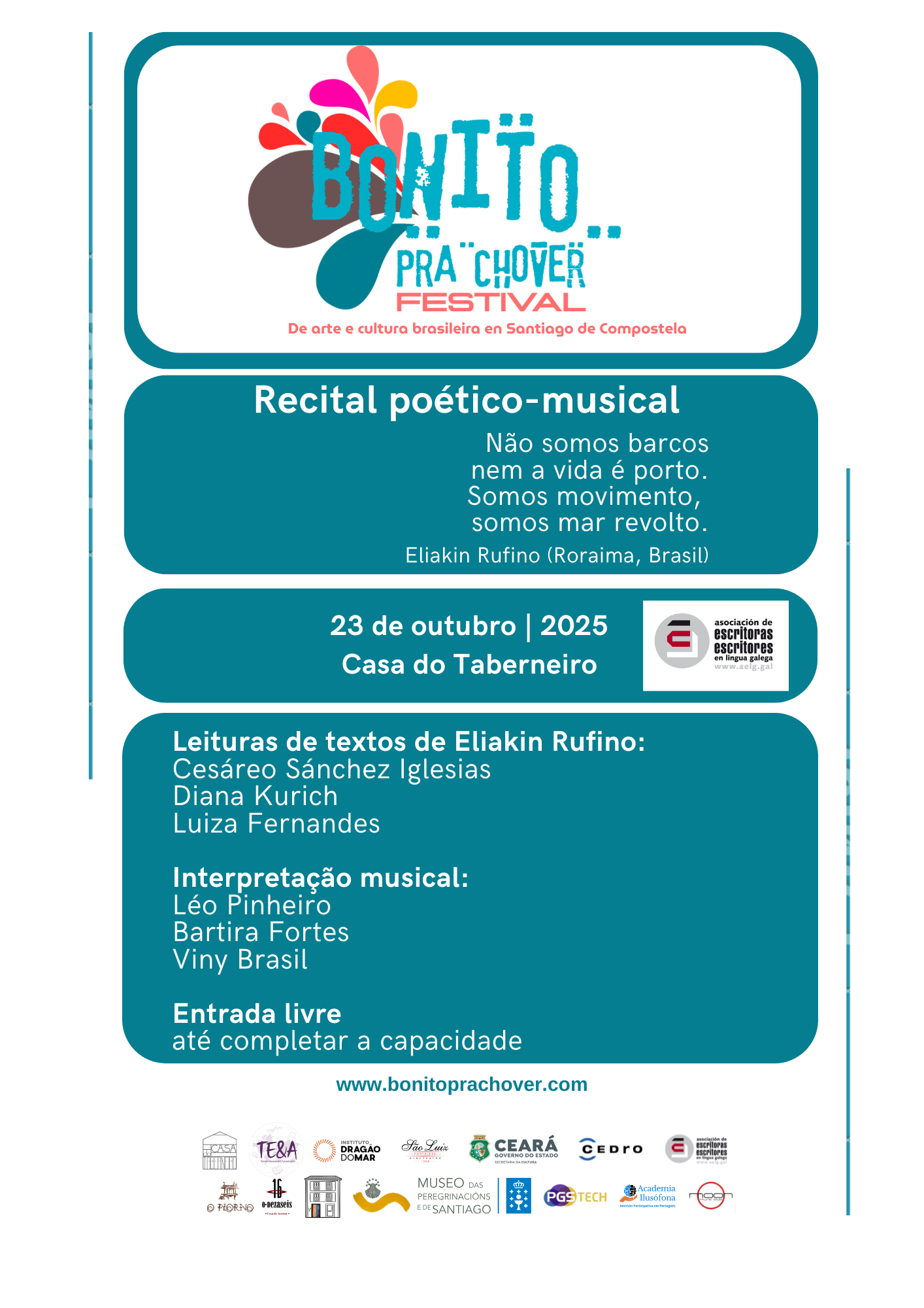 Do 20 ao 26 de outubro de 2025 Santiago acollerá a fusión de culturas galega e brasileira: o II Festival Bonito Pra Chover. O festival é unha homenaxe a Galiza, adoptada como casa propia. O presente a compartir será a arte que desborda o Brasil chegando á Galicia. Como na primeira edición no 2024, en outubro Compostela vai ter chuvia de poesía, música, cine, imaxes diversas, sabores e encontros que o Bonito Pra Chover traerá á cidade. O festival rende homenaxe á riqueza cultural que entrelaza acentos e historias das dúas bandas do océano. Bonito Pra Chover reflicte esta pluralidade. En 2024 estiveron presentes distintos estados do Brasil: Ceará, Roraima, Rio de Janeiro e Tocantins. Nesa segunda edición, ampliamos e a maiores recibimos representantes de Bahia e Minas Gerais. O Bonito Pra Chover trae a Galicia un Brasil que non se ve nos titulares, senón que pulsa en cada recuncho, coas súas cores, voces e sabores. Serán distintas expresións e ámbitos culturais, dende a música á poesía ou o cinema, nesa semana iremos cantar, bailar, recitar e ver o cinema brasileiro. Tamén provaremos a súa gastronomía, compartindo coa Galicia un Brasil diverso. Así que agardamos encher Santiago de arte para mergullalo nos matices culturais do Brasil. Máis que un evento, Bonito Pra Chover é unha oportunidade para coñecer. Unha invitación ao intercambio entre culturas irmás, un abrazo cálido que estende as mans de Galiza ao Brasil e viceversa. O programa variado e atractivo trae unha axenda inescusable para quen queira sentir, escoitar e degustar esta unión cultural. Estamos seguros de que cada evento ha ser unha celebración dese encontro feito de artistas, pobos e desexos.
