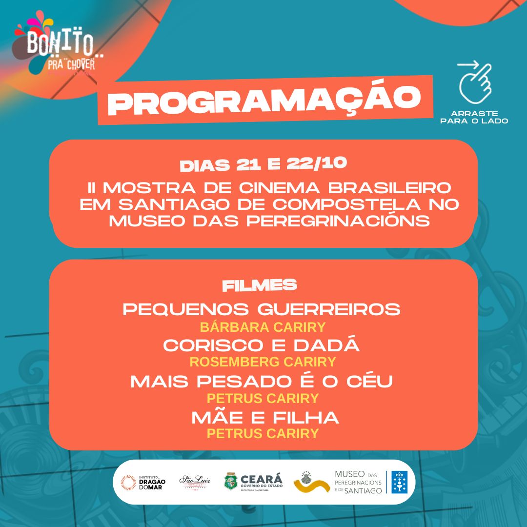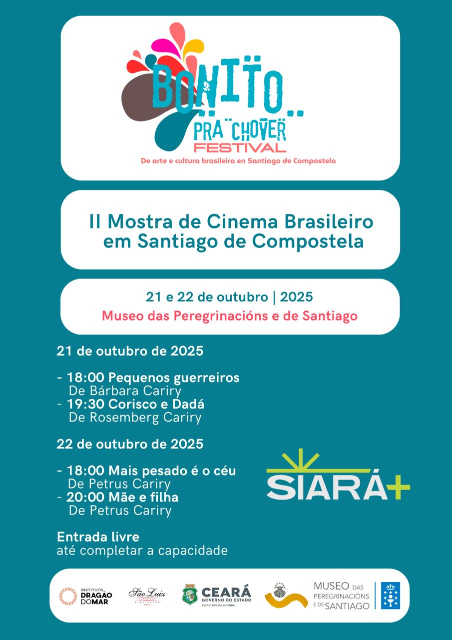 – 21 e 22 de outubro II Mostra de Cinema Brasileiro en Santiago de Compostela. Proxección das películas: Corisco e Dadá, Mãe e Filha, Pequenos Guerreiros, e Mais pesado é o céu. Lugar: Museo das Peregrinacións de Santiago. Organizado en colaboración co Siará+, primeiro streaming dedicado ao audiovisual cearense, iniciativa da Secretaria da Cultura do Ceará (Secult), Cineteatro São Luiz e Instituto Dragão do Mar (IDM), co apoio técnico e de licenciamento do Instituto Tamanduá Synapse Cultural.