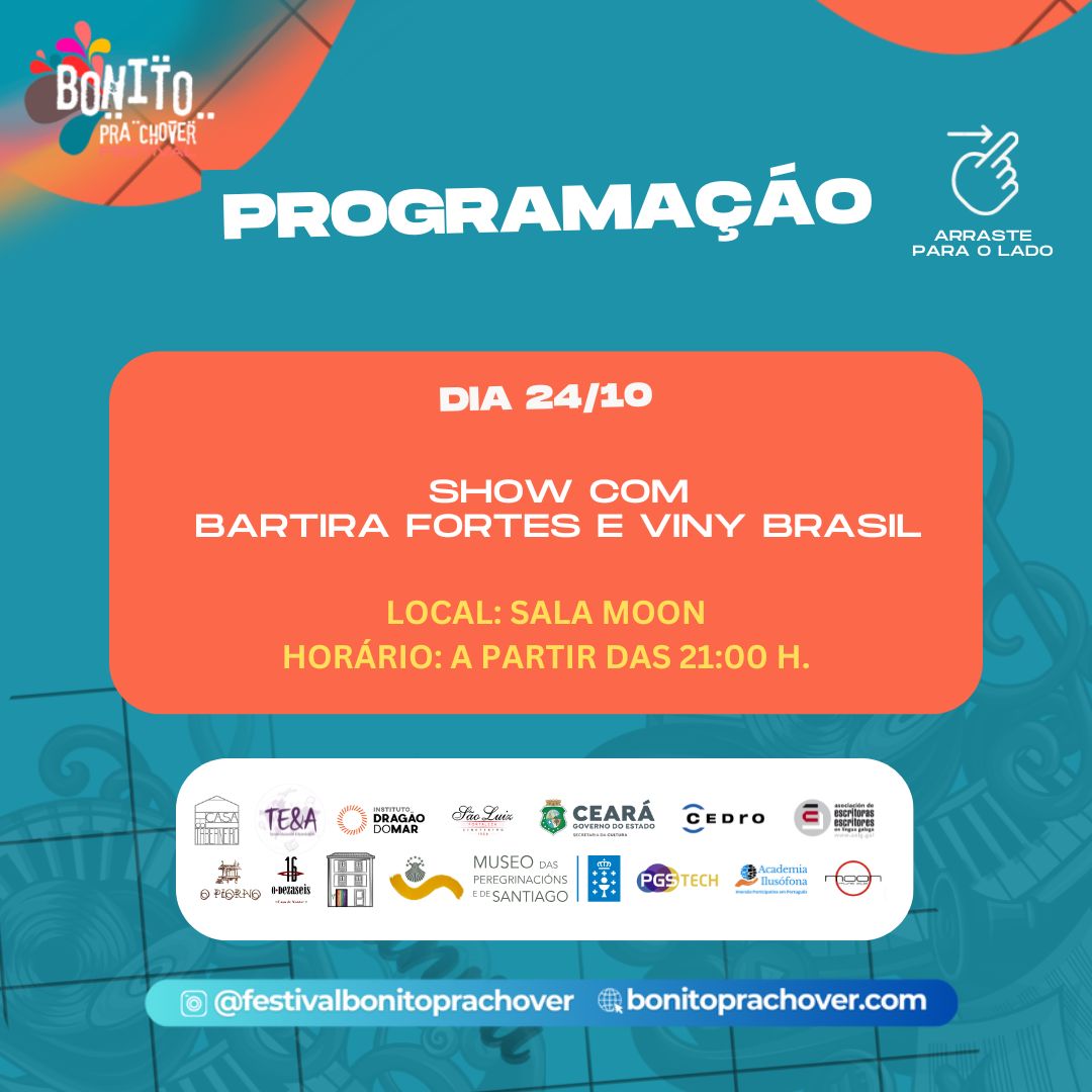 – 24 de outubro Concertos de Bartira Fortes e de Viny Brasil. Lugar: Sala Moon. Horario: a partir das 21:00 horas.