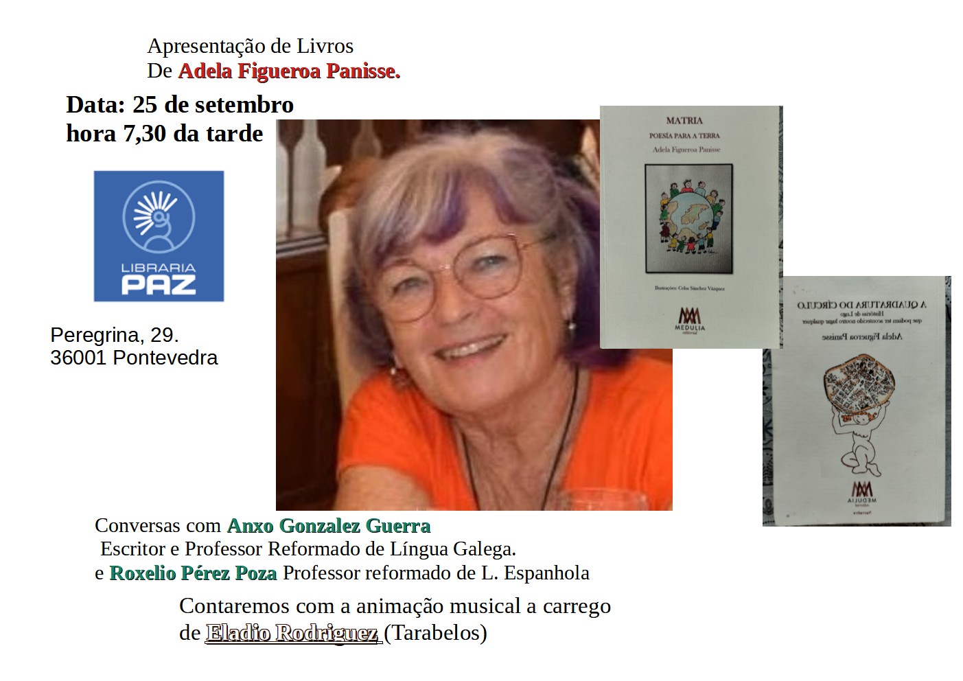 O mércores 27 de abril, ás 20:00 h., na Galería Sargadelos (Rúa da Oliva) de Pontevedra, preséntase a colectánea de relatos Madeira de mulher, de Adela Figueroa Panisse, publicada en Edicións do Castro. No acto, presentado Roxelio Pérez Poza e Francisco Cerviño González, terá lugar a actuación musical do grupo de gaiteiros Os do Luns.